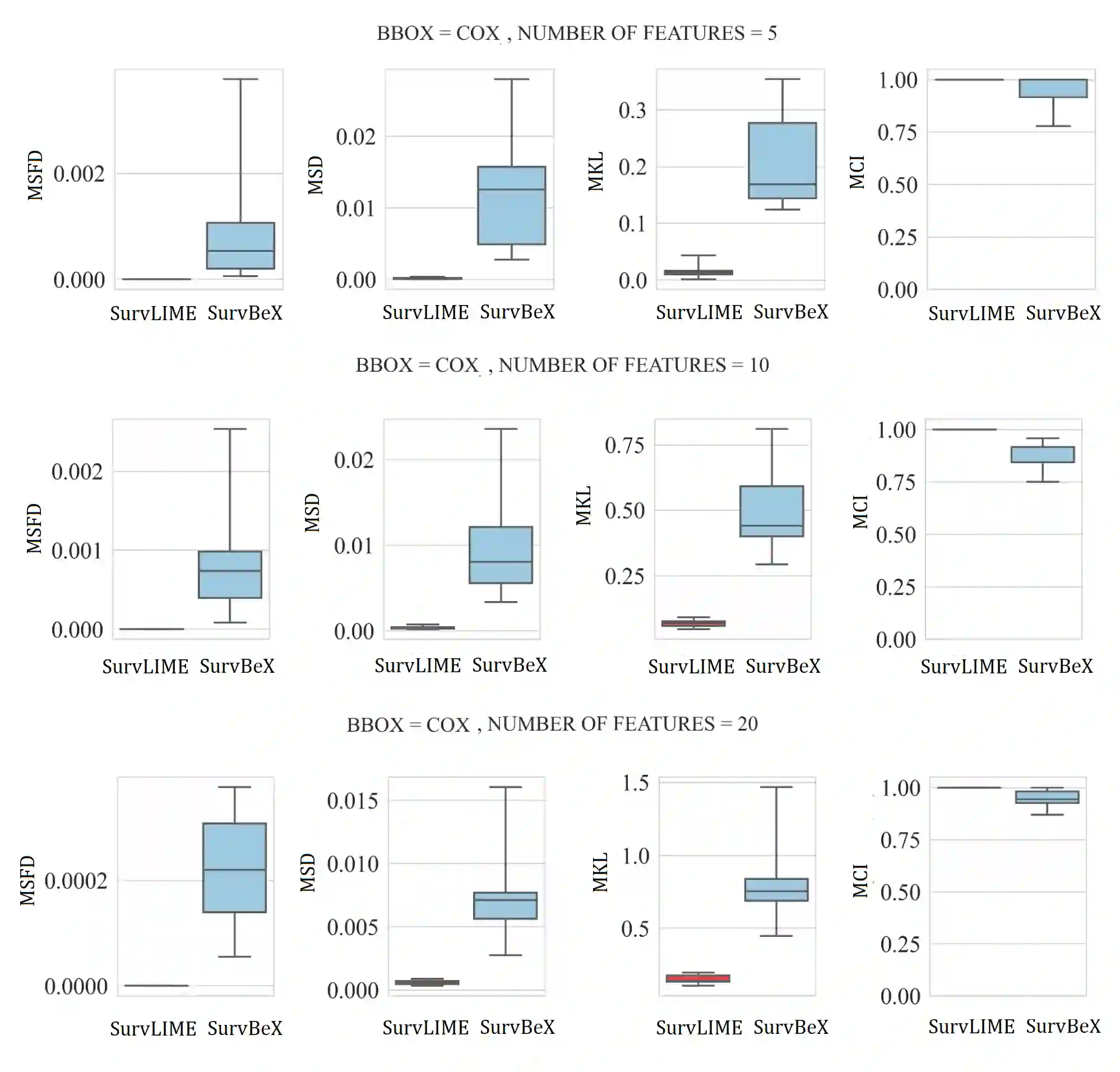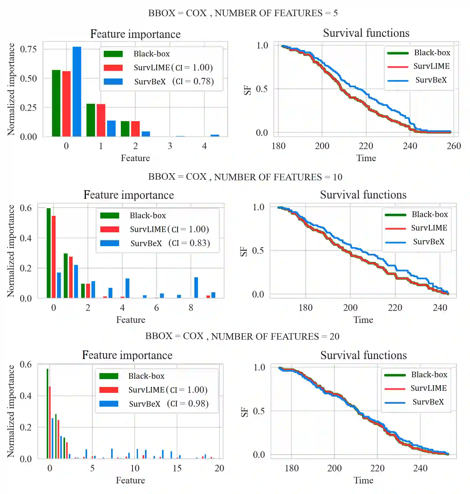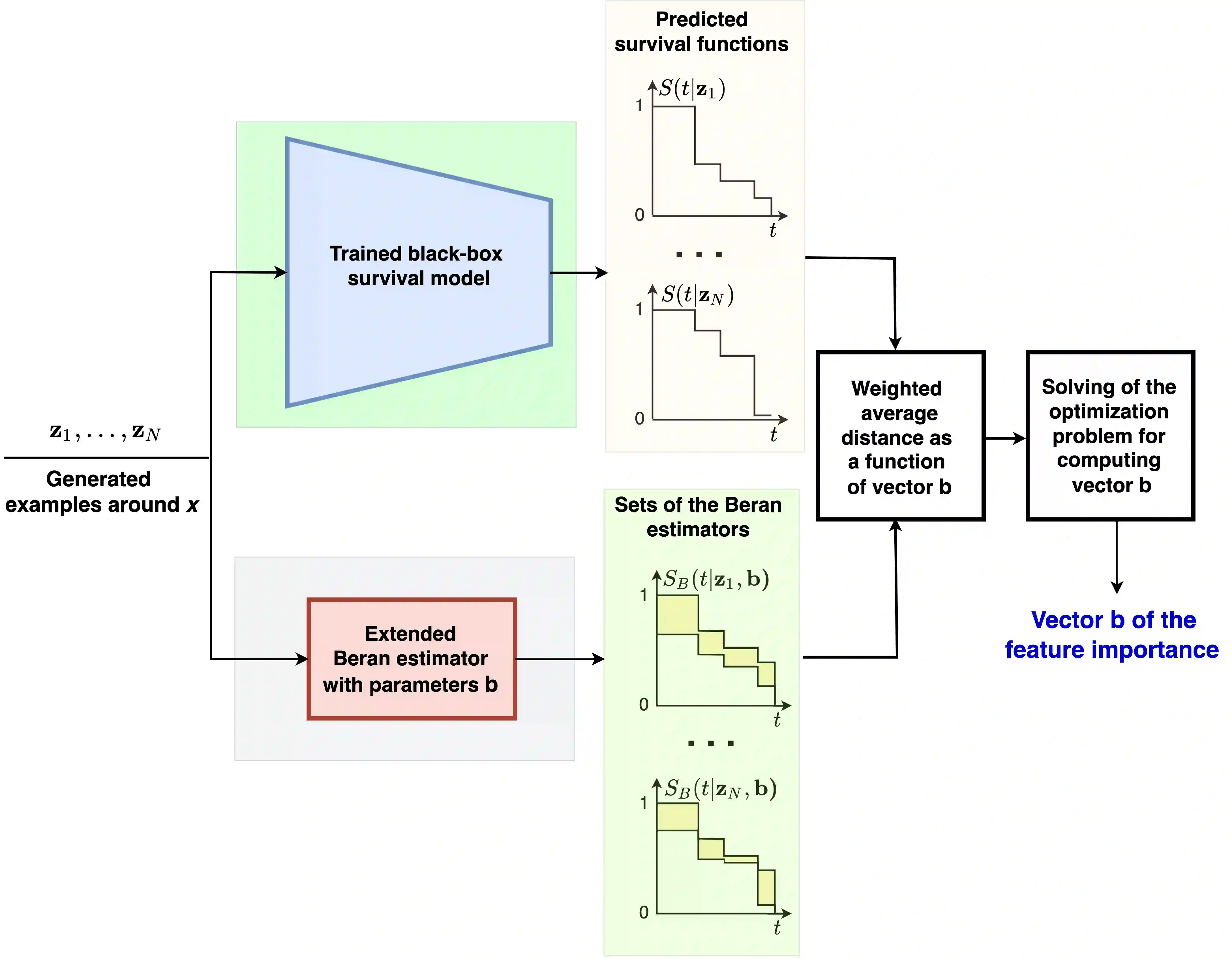 An explanation method called SurvBeX is proposed to interpret predictions of the machine learning survival black-box models. The main idea behind the method is to use the modified Beran estimator as the surrogate explanation model. Coefficients, incorporated into Beran estimator, can be regarded as values of the feature impacts on the black-box model prediction. Following the well-known LIME method, many points are generated in a local area around an example of interest. For every generated example, the survival function of the black-box model is computed, and the survival function of the surrogate model (the Beran estimator) is constructed as a function of the explanation coefficients. In order to find the explanation coefficients, it is proposed to minimize the mean distance between the survival functions of the black-box model and the Beran estimator produced by the generated examples. Many numerical experiments with synthetic and real survival data demonstrate the SurvBeX efficiency and compare the method with the well-known method SurvLIME. The method is also compared with the method SurvSHAP. The code implementing SurvBeX is available at: https://github.com/DanilaEremenko/SurvBeX