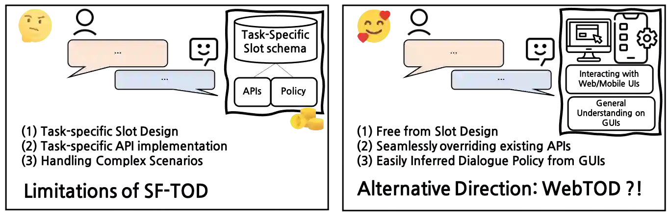 Task-oriented dialogue (TOD) systems are mainly based on the slot-filling-based TOD (SF-TOD) framework, in which dialogues are broken down into smaller, controllable units (i.e., slots) to fulfill a specific task. A series of approaches based on this framework achieved remarkable success on various TOD benchmarks. However, we argue that the current TOD benchmarks are limited to surrogate real-world scenarios and that the current TOD models are still a long way from unraveling the scenarios. In this position paper, we first identify current status and limitations of SF-TOD systems. After that, we explore the WebTOD framework, the alternative direction for building a scalable TOD system when a web/mobile interface is available. In WebTOD, the dialogue system learns how to understand the web/mobile interface that the human agent interacts with, powered by a large-scale language model.