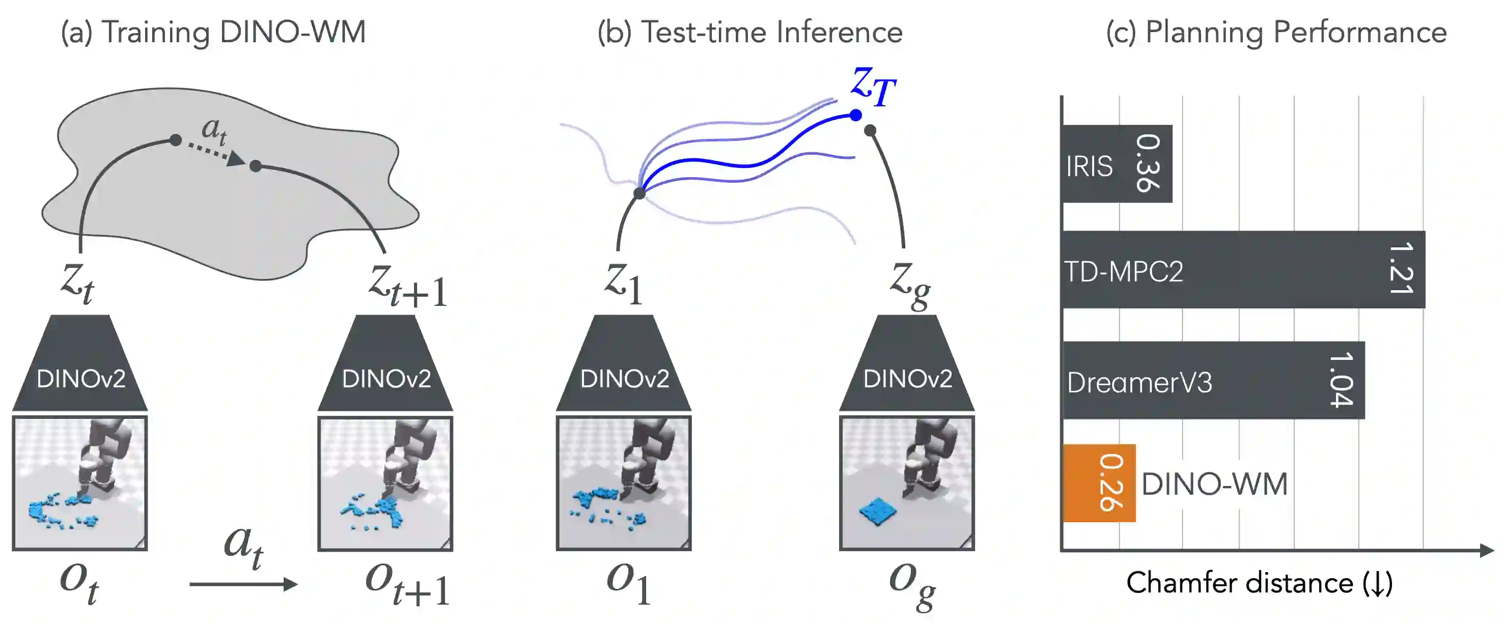 翻译:在给定控制动作的情况下预测未来结果的能力是物理推理的基础。然而,这类通常被称为世界模型的预测模型已被证明难以学习,并且通常是为结合在线策略学习的任务特定解决方案而开发的。我们认为,世界模型的真正潜力在于其仅利用被动数据就能在不同问题上进行推理和规划的能力。具体而言,我们要求世界模型具备以下三个属性:1) 可在离线预收集的轨迹上进行训练,2) 支持测试时的行为优化,3) 促进任务无关的推理。为实现这一目标,我们提出了DINO世界模型(DINO-WM),这是一种无需重建视觉世界即可对视觉动态进行建模的新方法。DINO-WM利用了通过DINOv2预训练的空间图像块特征,使其能够通过预测未来的图像块特征来从离线行为轨迹中学习。这种设计使得DINO-WM能够通过动作序列优化来实现观测目标,通过将期望的目标图像块特征作为预测目标,从而促进任务无关的行为规划。我们在多个领域评估了DINO-WM,包括迷宫导航、桌面推物和粒子操控。我们的实验表明,DINO-WM能够在测试时生成零样本行为解决方案,而无需依赖专家演示、奖励建模或预学习的逆模型。值得注意的是,与先前最先进的工作相比,DINO-WM展现出强大的泛化能力,能够适应多样化的任务族,例如任意配置的迷宫、不同物体形状的推物操作以及多粒子场景。