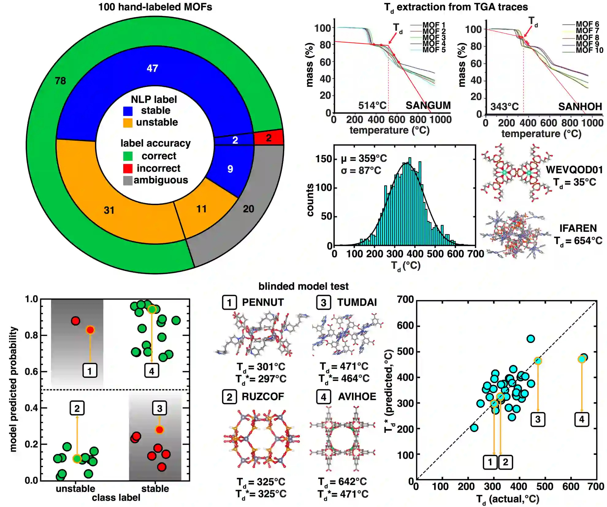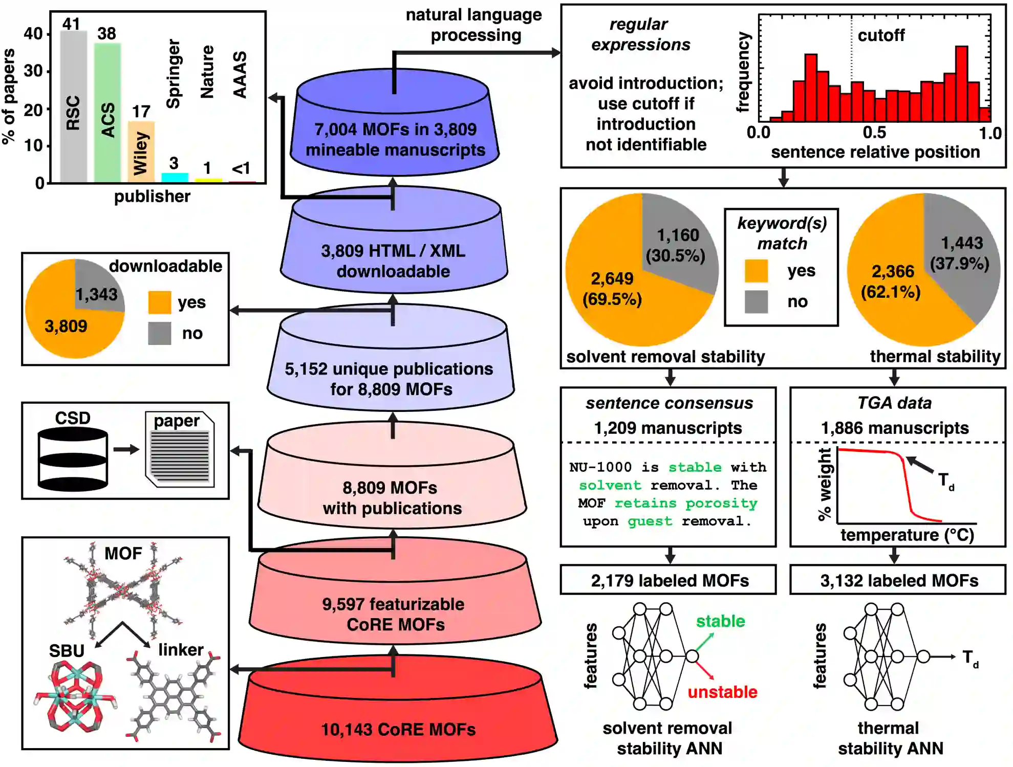 翻译:我们报告了一个基于自然语言处理(NLP)的程序的工作流程和产出,用于开采现有金属-有机框架(MOF)文献,描述结构特征的MOF及其溶剂去除和热稳定。我们从文本开采中获得了2,000多项溶剂去除稳定性措施,从温度测量分析数据中获得3,000个热分解温度。我们通过比较手标子来评估我们的NLP方法的有效性和我们提取数据的准确性。利用图形和孔地测量法的表示法(ML,即人工神经网络)对这些数据进行了培训,从而能够预测具有量化不确定性的新MOF的稳定性。我们的网络界面“MFSimplifri化”为用户提供了访问我们所整理的数据的途径,并使他们能够利用这些数据预测新的MOF。MOFSimplifil化还鼓励社区对现有数据和ML模型的反馈,以便社区积极学习改进MOF稳定性模型。