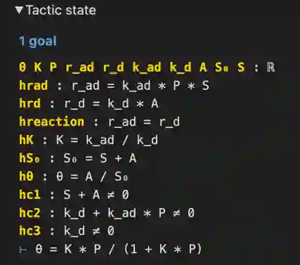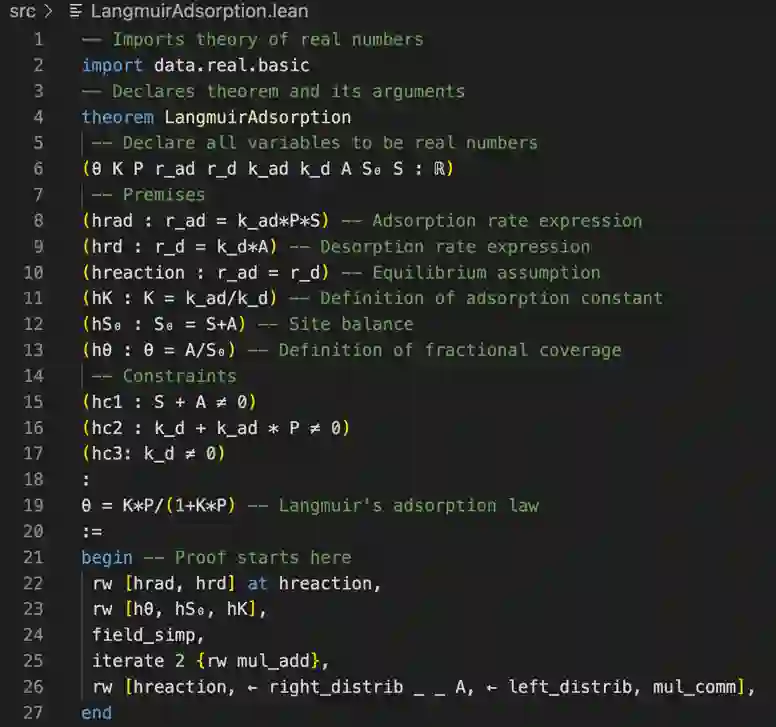 翻译:使用Lean Theorem 验证器可以使化学理论更加严格, 这是一种互动理论, 可以证明复杂的数学。 我们正式确定Langmuir和BET吸收理论, 使每个科学前提和衍生的每一个步骤都清楚明晰。 Lean的数学图书馆Mathlib 提供了无限的地貌序列正式核实的理论, 这对理论来说至关重要。 在写这些证据时, Lean 促使我们把原先没有报告的数学限制包括在内。 我们还说明Lian 如何通过使用功能、 定义和结构, 使建立在更复杂的理论之上的证明得以重新使用。 最后, 我们通过建立古典热力学和运动学的结构, 利用它们来正式确定气体法关系, 如 Boyle 法 和 Newtonian 机械基础的动作等式。 这种方法可以推广到其他领域, 使科学和工程的丰富和复杂的理论正规化。