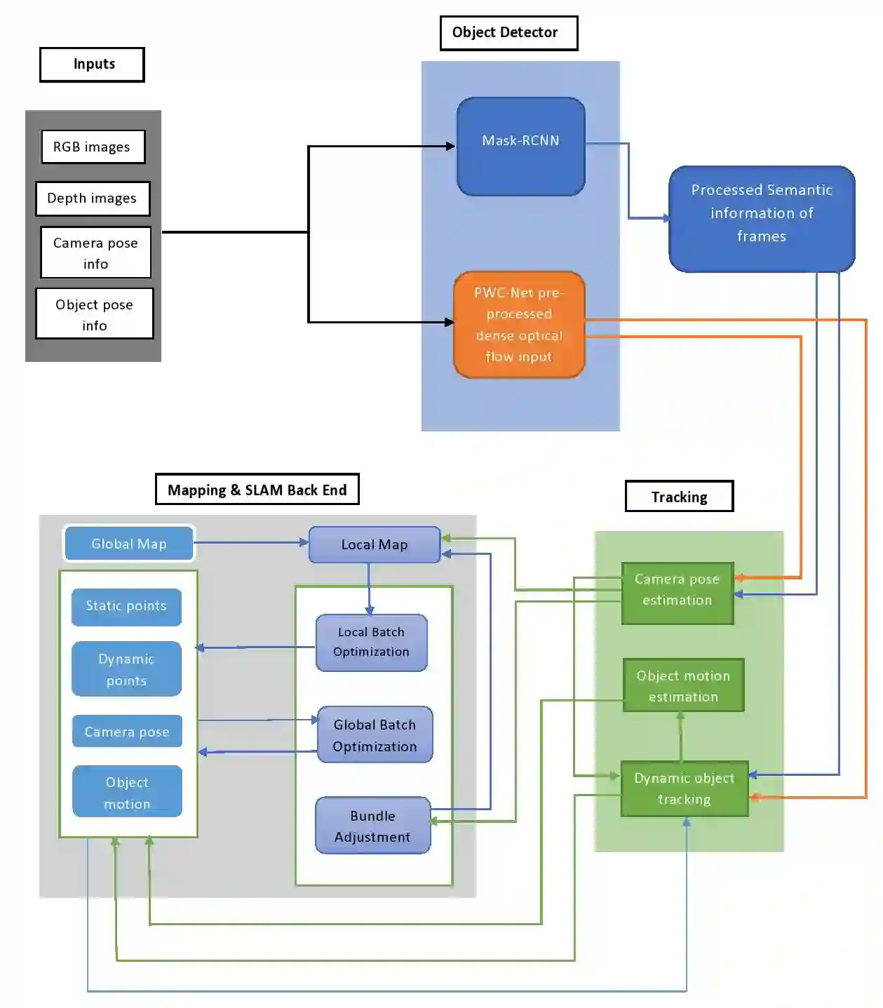翻译:同步本地化和绘图( SLAM) 是一个在周围环境对象本地化和绘图之间建立相互关系的过程。 在不同传感器的帮助下, 各类 SLAM 系统已经开发出各种类型的 SLAM 系统, 以解决建立本地化和映射之间的关系问题。 SLAM 进程的一个局限性是在环境映射中缺乏对动态物体的考虑。 我们提议了动态物体跟踪 SLAM (DyOb- SLAM) 系统, 这是一种视觉 SLAM 系统, 可以在环境周围对象的定位和绘图以及跟踪每个框架的动态对象。 在神经网络和密集的光学流算法的帮助下, 各种类型的 SLAM 系统已经开发出各种动态物体, DyOb- SLAM 系统可以将动态物体的性能与动态物体的性能进行对比, 以SLASM 系统所观测到的性能速度, 将VOAM 系统与所观测到的动态物体的性能速度进行对比。