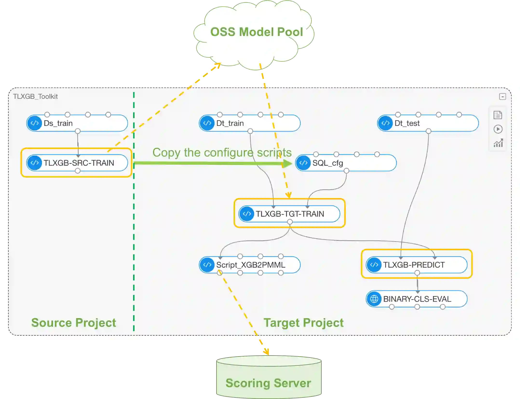 Secure online transaction is an essential task for e-commerce platforms. Alipay, one of the world's leading cashless payment platform, provides the payment service to both merchants and individual customers. The fraud detection models are built to protect the customers, but stronger demands are raised by the new scenes, which are lacking in training data and labels. The proposed model makes a difference by utilizing the data under similar old scenes and the data under a new scene is treated as the target domain to be promoted. Inspired by this real case in Alipay, we view the problem as a transfer learning problem and design a set of revise strategies to transfer the source domain models to the target domain under the framework of gradient boosting tree models. This work provides an option for the cold-starting and data-sharing problems.