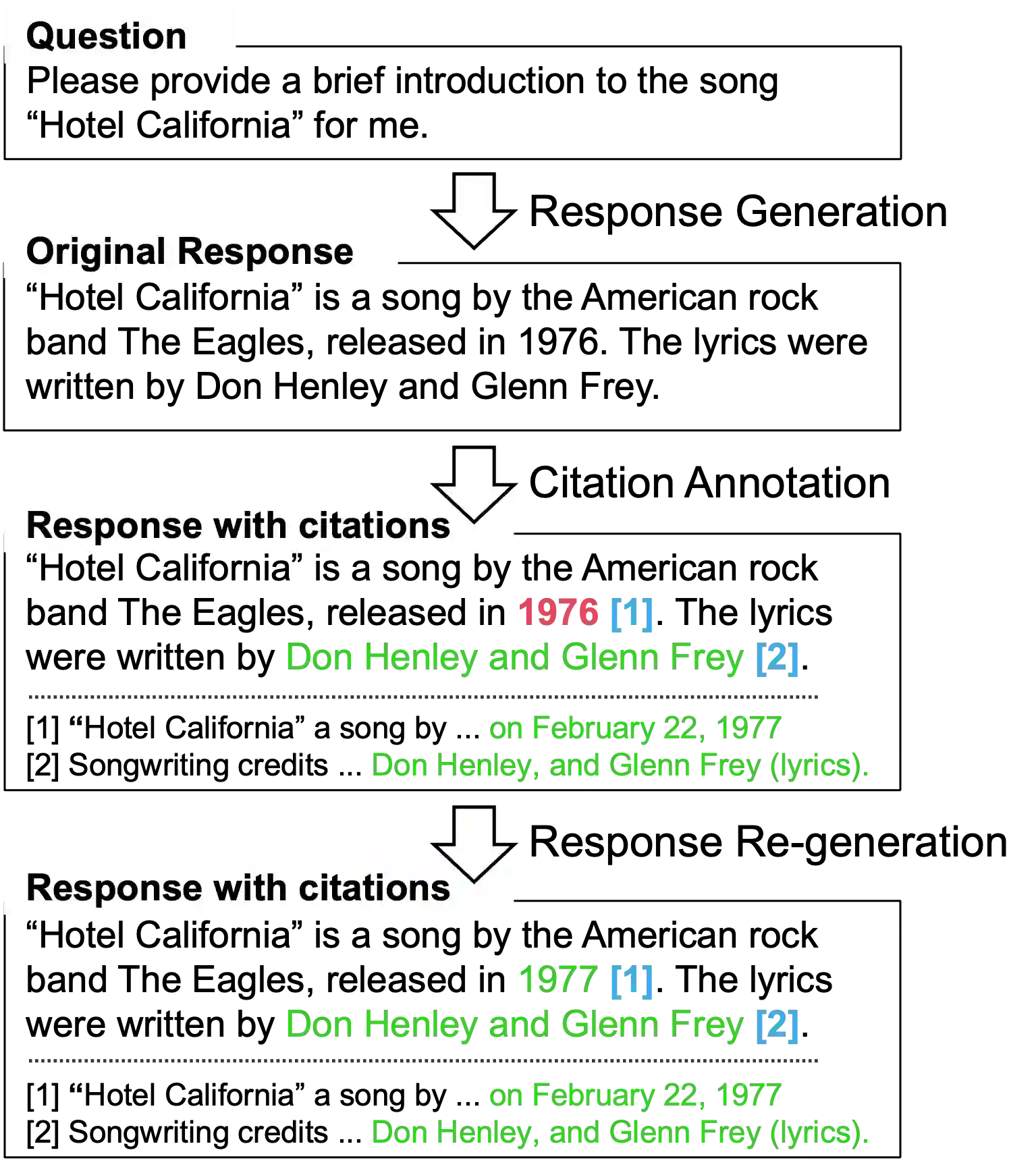 Large language models (LLMs) exhibit powerful general intelligence across diverse scenarios, including their integration into chatbots. However, a vital challenge of LLM-based chatbots is that they may produce hallucinated content in responses, which significantly limits their applicability. Various efforts have been made to alleviate hallucination, such as retrieval augmented generation and reinforcement learning with human feedback, but most of them require additional training and data annotation. In this paper, we propose a novel post-hoc Citation-Enhanced Generation (CEG) approach combined with retrieval argumentation. Unlike previous studies that focus on preventing hallucinations during generation, our method addresses this issue in a post-hoc way. It incorporates a retrieval module to search for supporting documents relevant to the generated content, and employs a natural language inference-based citation generation module. Once the statements in the generated content lack of reference, our model can regenerate responses until all statements are supported by citations. Note that our method is a training-free plug-and-play plugin that is capable of various LLMs. Experiments on various hallucination-related datasets show our framework outperforms state-of-the-art methods in both hallucination detection and response regeneration on three benchmarks. Our codes and dataset will be publicly available.
