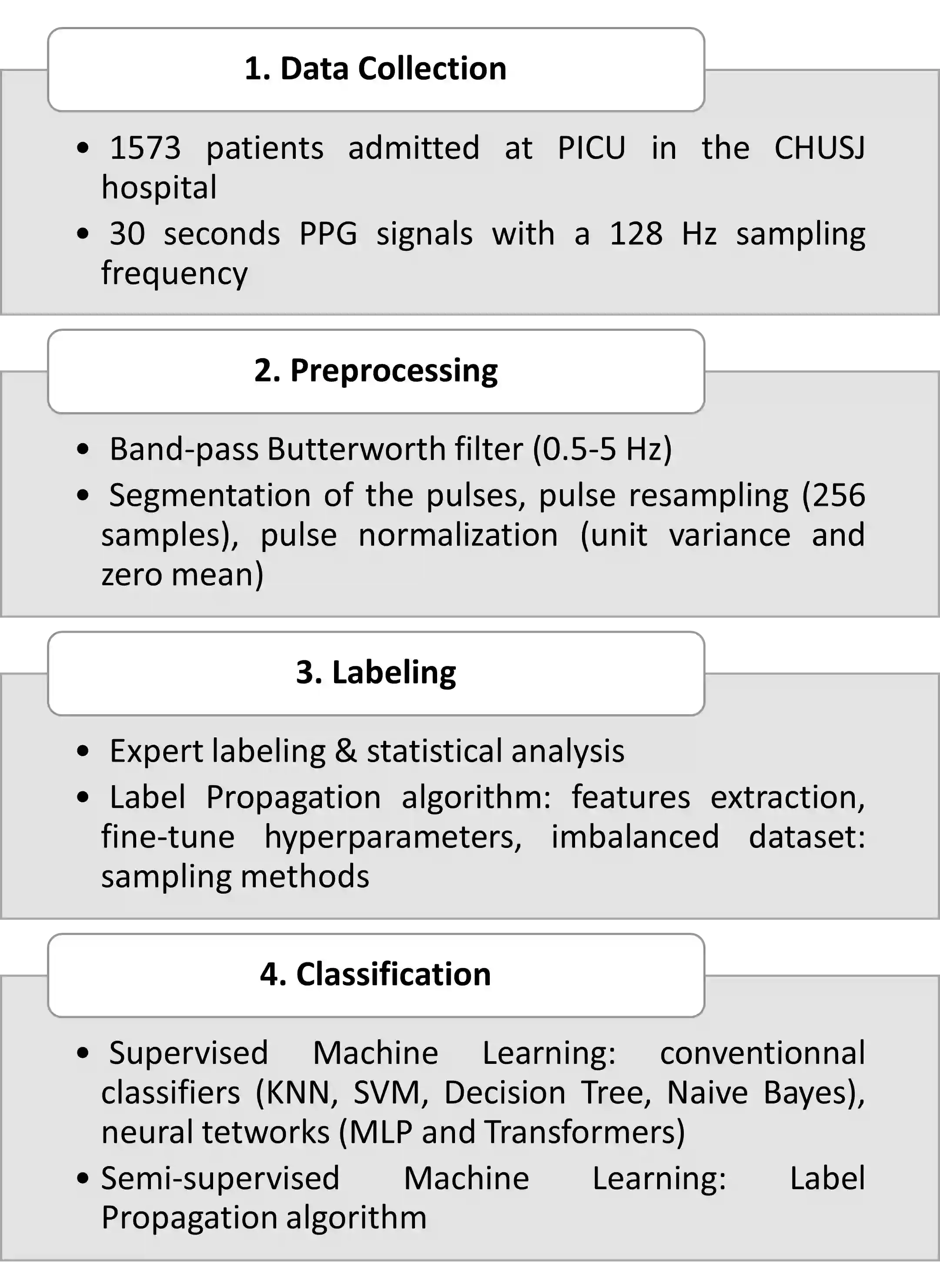 Photoplethysmogram (PPG) signals are widely used in healthcare for monitoring vital signs, but they are susceptible to motion artifacts that can lead to inaccurate interpretations. In this study, the use of label propagation techniques to propagate labels among PPG samples is explored, particularly in imbalanced class scenarios where clean PPG samples are significantly outnumbered by artifact-contaminated samples. With a precision of 91%, a recall of 90% and an F1 score of 90% for the class without artifacts, the results demonstrate its effectiveness in labeling a medical dataset, even when clean samples are rare. For the classification of artifacts our study compares supervised classifiers such as conventional classifiers and neural networks (MLP, Transformers, FCN) with the semi-supervised label propagation algorithm. With a precision of 89%, a recall of 95% and an F1 score of 92%, the KNN supervised model gives good results, but the semi-supervised algorithm performs better in detecting artifacts. The findings suggest that the semi-supervised algorithm label propagation hold promise for artifact detection in PPG signals, which can enhance the reliability of PPG-based health monitoring systems in real-world applications.