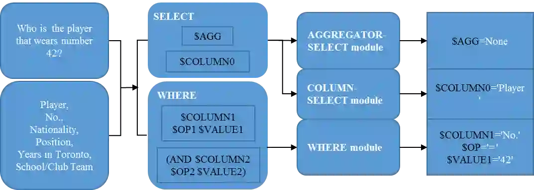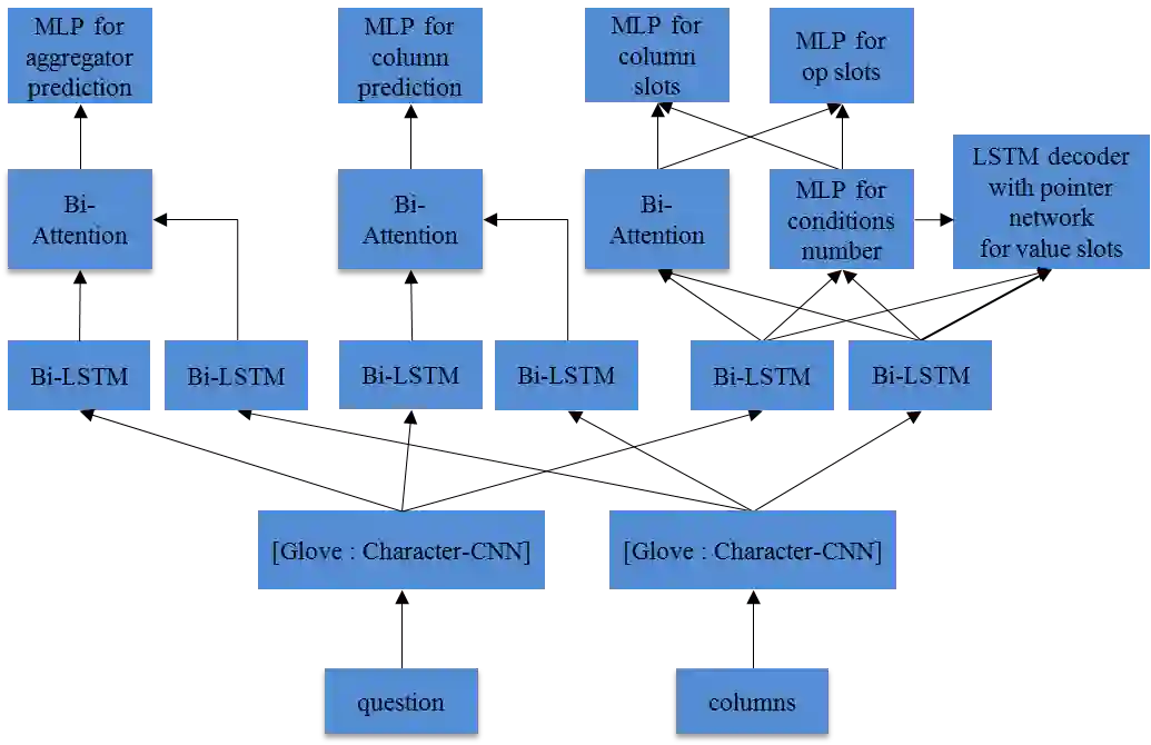 翻译:从自然语言中生成结构性查询语言( SQL) 是一个长期存在的未决问题。 回答关于数据库表格的自然语言问题,需要将表格各列和问题之间的复杂互动进行模型化。 在本文中,我们应用合成方法解决这一问题。 根据 SQL 查询的结构,我们将模型分成三个子模块,并为每个模块设计具体的深神经网络。 受类似机器阅读任务的启发,我们利用双向关注机制和字符级嵌入进进进进进化神经网络(CNNs)来改进结果。 实验评估显示,我们的模型实现了WikisQL数据集的最新结果。
