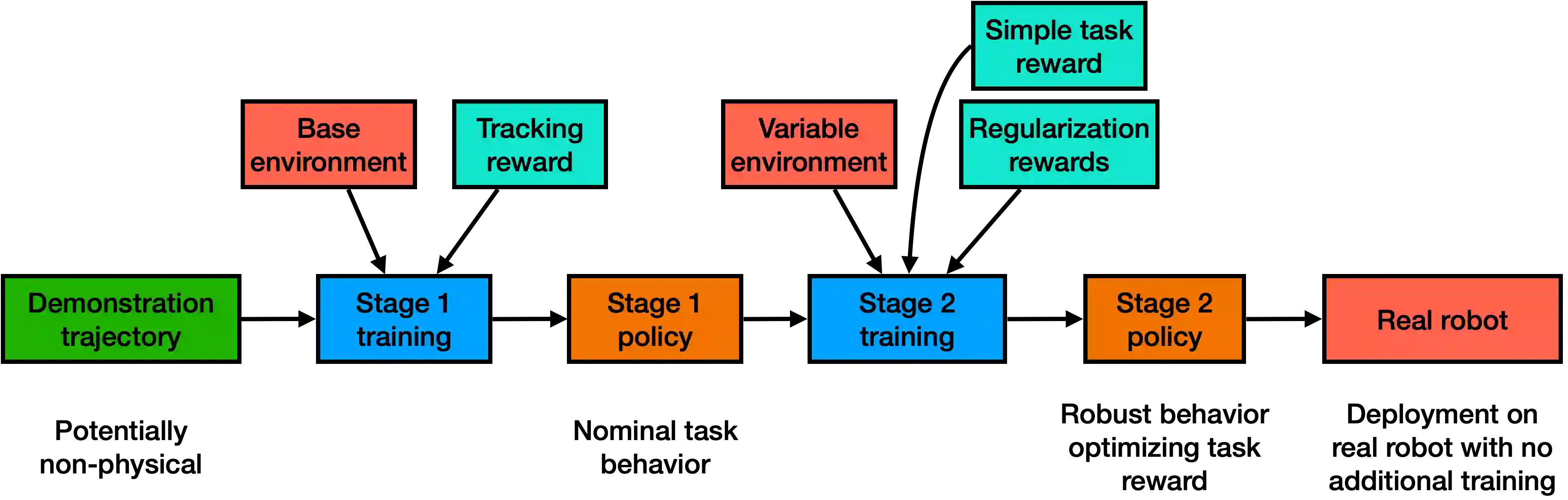 翻译:在这项工作中,我们提出了一个一般的、分为两个阶段的强化学习方法,即从单一的示范轨迹走向一项强有力的政策,在不经过任何额外培训的情况下,可以在硬件上部署。演示在第一阶段作为便利初步勘探的起点。在第二阶段,直接优化相关任务奖励,并计算出一项对环境不确定因素具有活力的政策。我们详细展示和审查我们对于高度动态的购物和捆绑在真正四重机器人身上的任务的做法的绩效和稳健性。