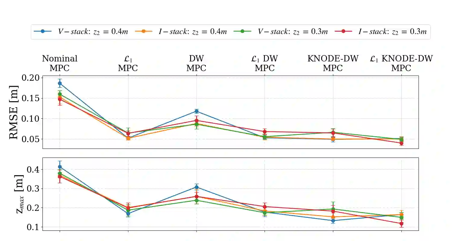 翻译:四旋翼飞行器团队在紧密编队飞行任务中面临严峻挑战,复杂的空气动力学尾流相互作用不仅会破坏单个成员的稳定性,还会影响整个编队的协同性能。此外,这些空气动力学效应具有高度非线性和快速时变特性,难以精确建模与预测。为应对这些挑战,本文提出L1 KNODE-DW MPC——一种基于混合专家学习的自适应控制框架,使单个四旋翼飞行器能够在编队飞行中精确跟踪轨迹,同时实时适应时变的空气动力学相互作用。我们在两种不同的三机编队构型中评估L1 KNODE-DW MPC,结果表明其性能优于多种MPC基线方法。实验证明,该框架能使三架四旋翼飞行器在整个飞行过程中保持垂直方向的紧密对齐。研究进一步发现,当L1自适应模块与精确动力学模型结合时,能最有效地补偿未建模扰动。展示框架原理与物理实验的视频可通过以下链接获取:https://youtu.be/9QX1Q5Ut9Rs