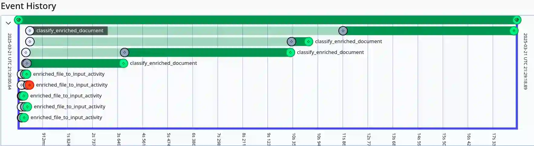 Classifying legal documents is a challenge, besides their specialized vocabulary, sometimes they can be very long. This means that feeding full documents to a Transformers-based models for classification might be impossible, expensive or slow. Thus, we present a legal document classifier based on DeBERTa V3 and a LSTM, that uses as input a collection of 48 randomly-selected short chunks (max 128 tokens). Besides, we present its deployment pipeline using Temporal, a durable execution solution, which allow us to have a reliable and robust processing workflow. The best model had a weighted F-score of 0.898, while the pipeline running on CPU had a processing median time of 498 seconds per 100 files.