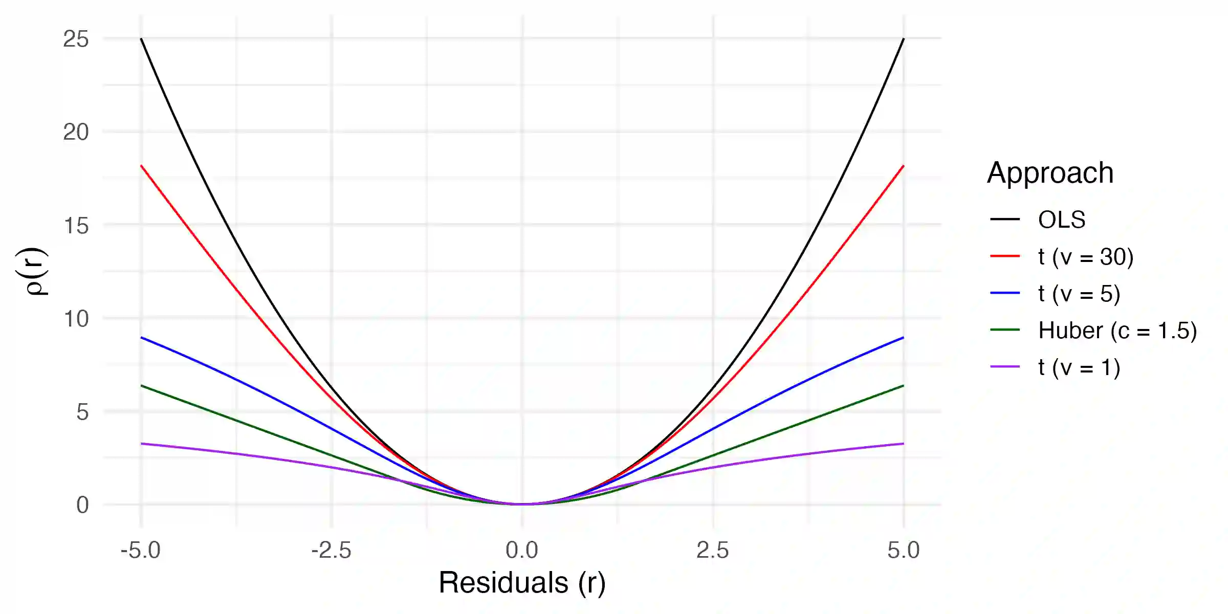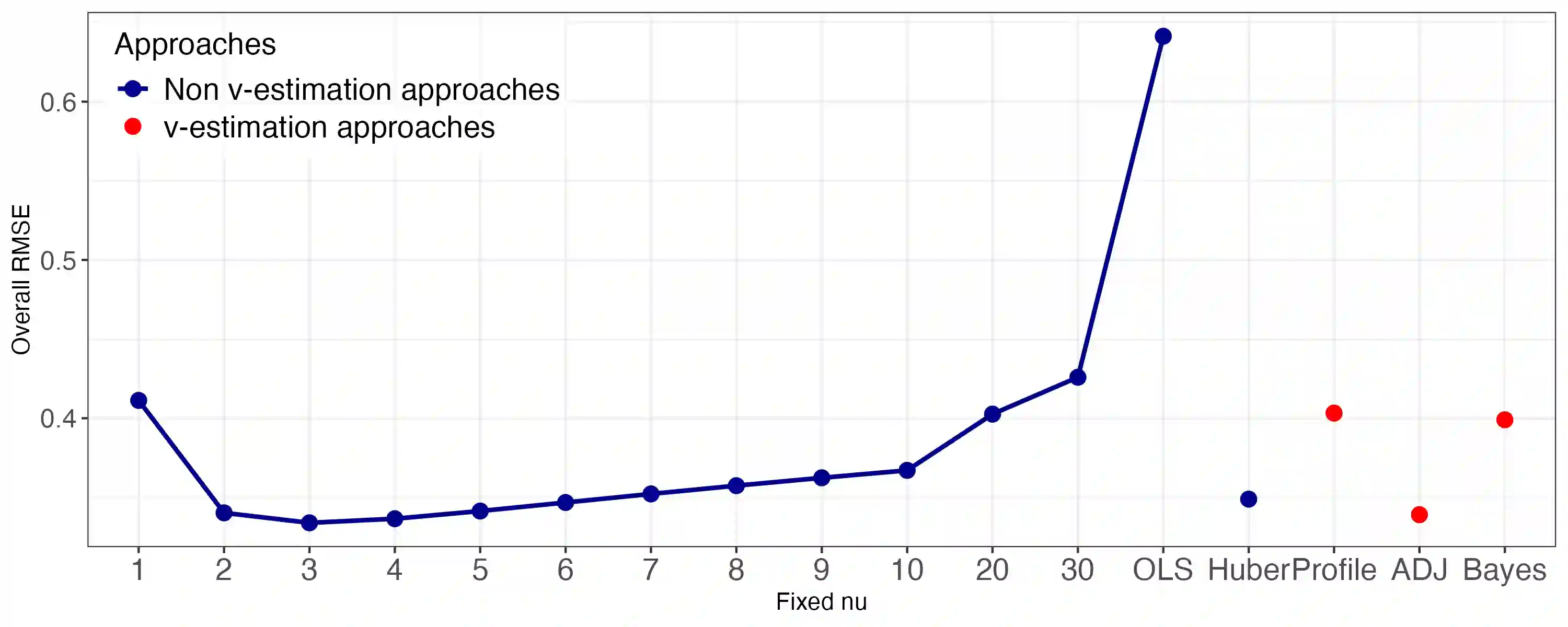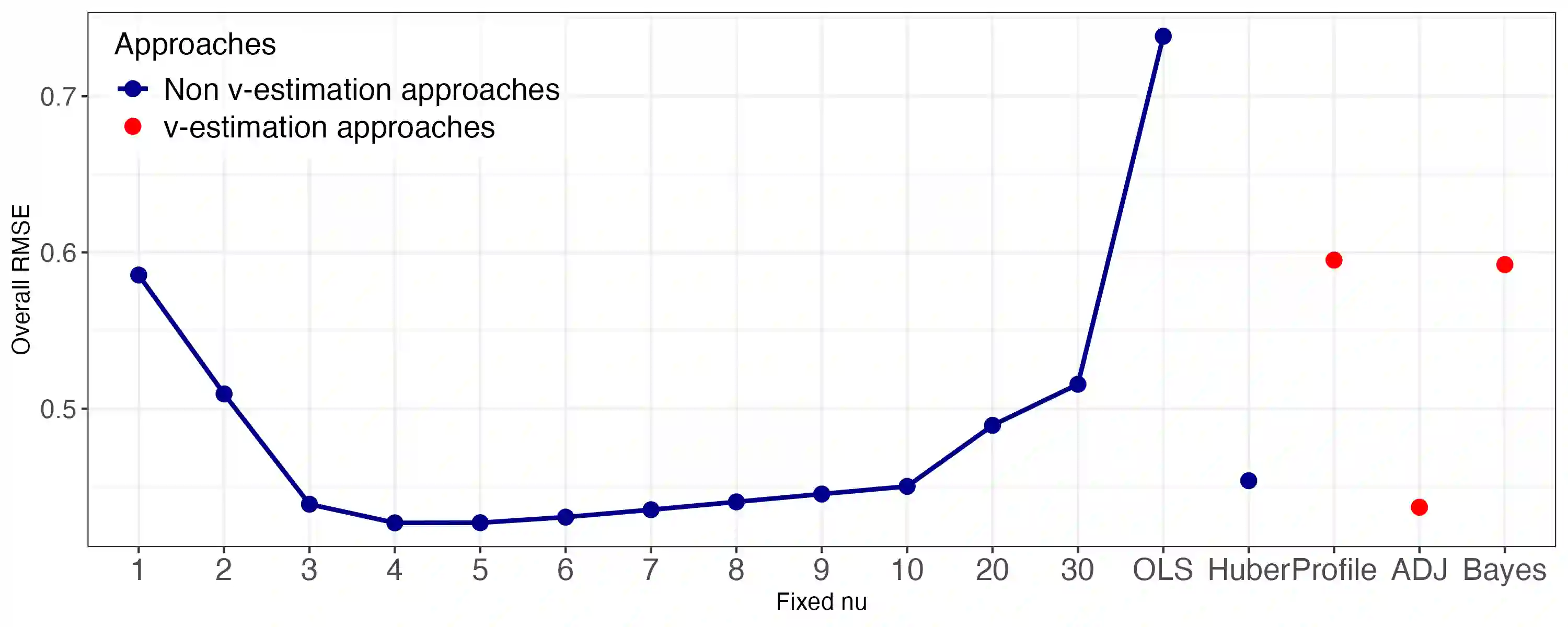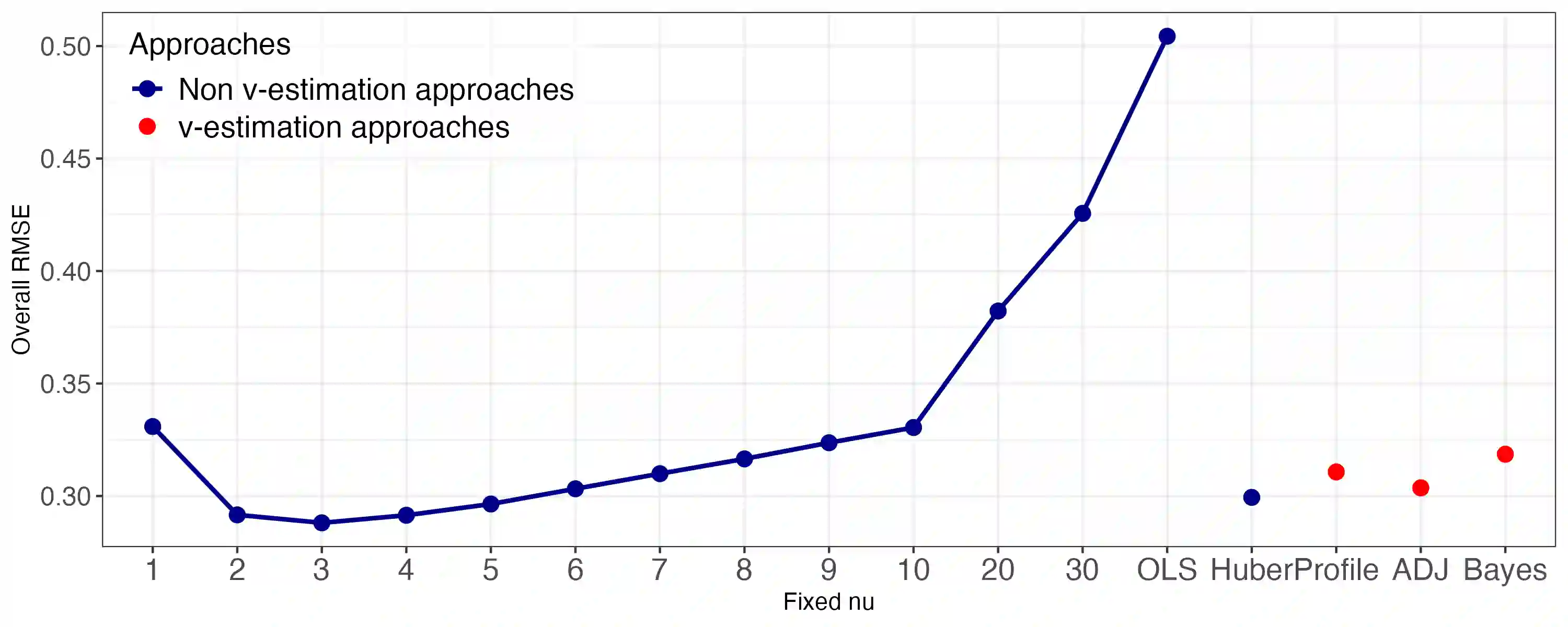 翻译:众所周知,线性回归估计量对异常值敏感,而获得回归参数的稳健且高效估计量的一种替代方法是用学生$t$分布对误差进行建模。本文中,我们使用频率学派和贝叶斯方法比较了$t$分布中自由度参数的估计量,进而研究了相应回归系数估计量的性质。我们还与文献中推荐的一些方法进行了比较,包括固定自由度的方法以及使用Huber损失的稳健回归。我们在合成数据和真实数据上进行的大量模拟实验表明,通过调整轮廓对数似然方法估计自由度,能够产生高精度的回归系数估计量,其性能与自由度固定在其真实值时的最大似然估计量相当。这些发现提供了对基于$t$分布的稳健回归的详细综合,并强调了一个关键见解:为实现最优性能,自由度的适当校准与稳健分布本身的选择同等重要。实现我们方法的{\tt R}软件包可在 https://github.com/amanda-ng518/RobustTRegression 获取。