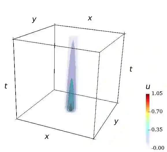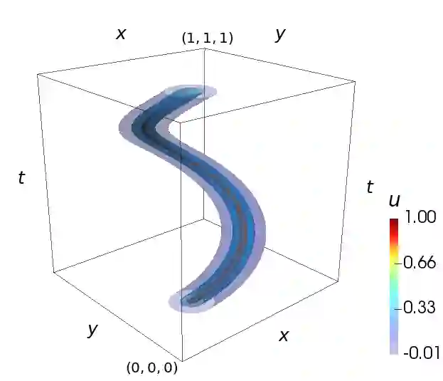 翻译:本文提出了一种在全时空域上求解对流-扩散方程的数值方法,该方法在保形网格上采用连续 Galerkin 有限元法。为确保离散变分问题的稳定性,采用了 Galerkin/最小二乘方法。在全时空表述中,时间被视为另一个维度,时间导数被解释为场变量的附加对流项。我们推导了先验误差估计,并通过多个数值算例展示了时空收敛性。同时,我们还推导了后验误差估计,结合自适应时空网格细化技术,可获得高效且精确的数值解。通过与解析解以及采用传统时间推进算法的数值解进行对比,验证了时空解法的精度。