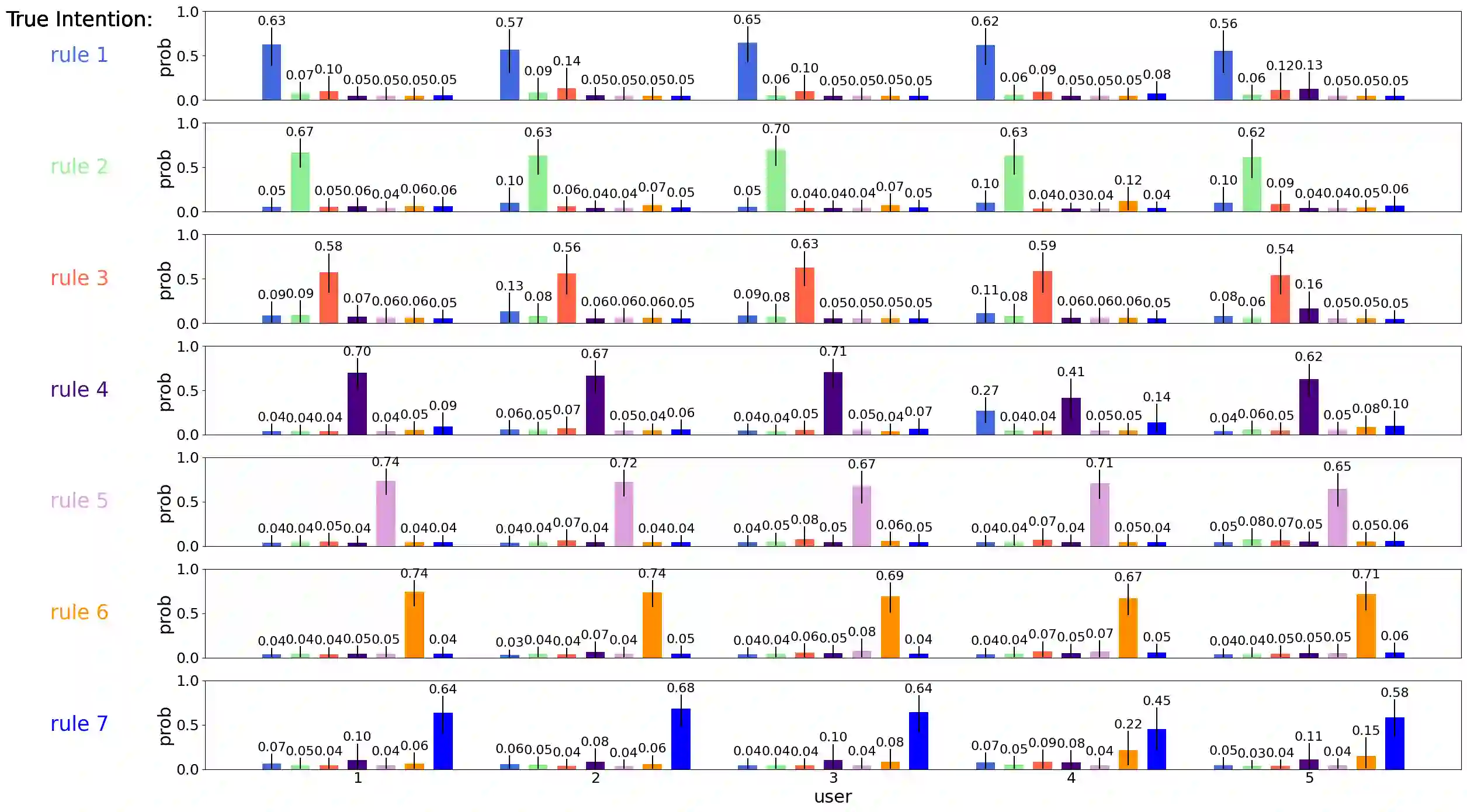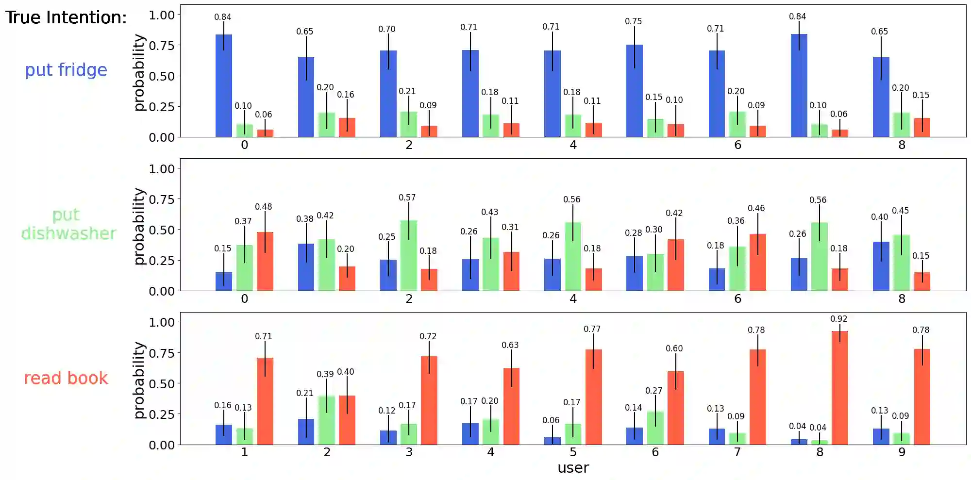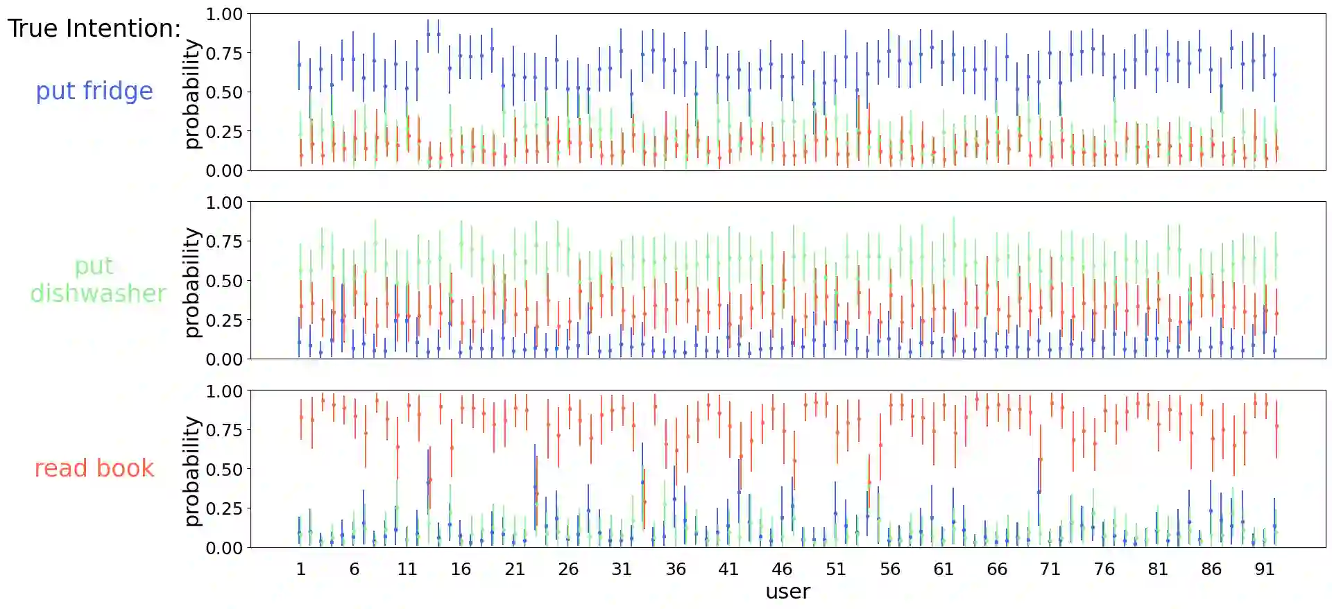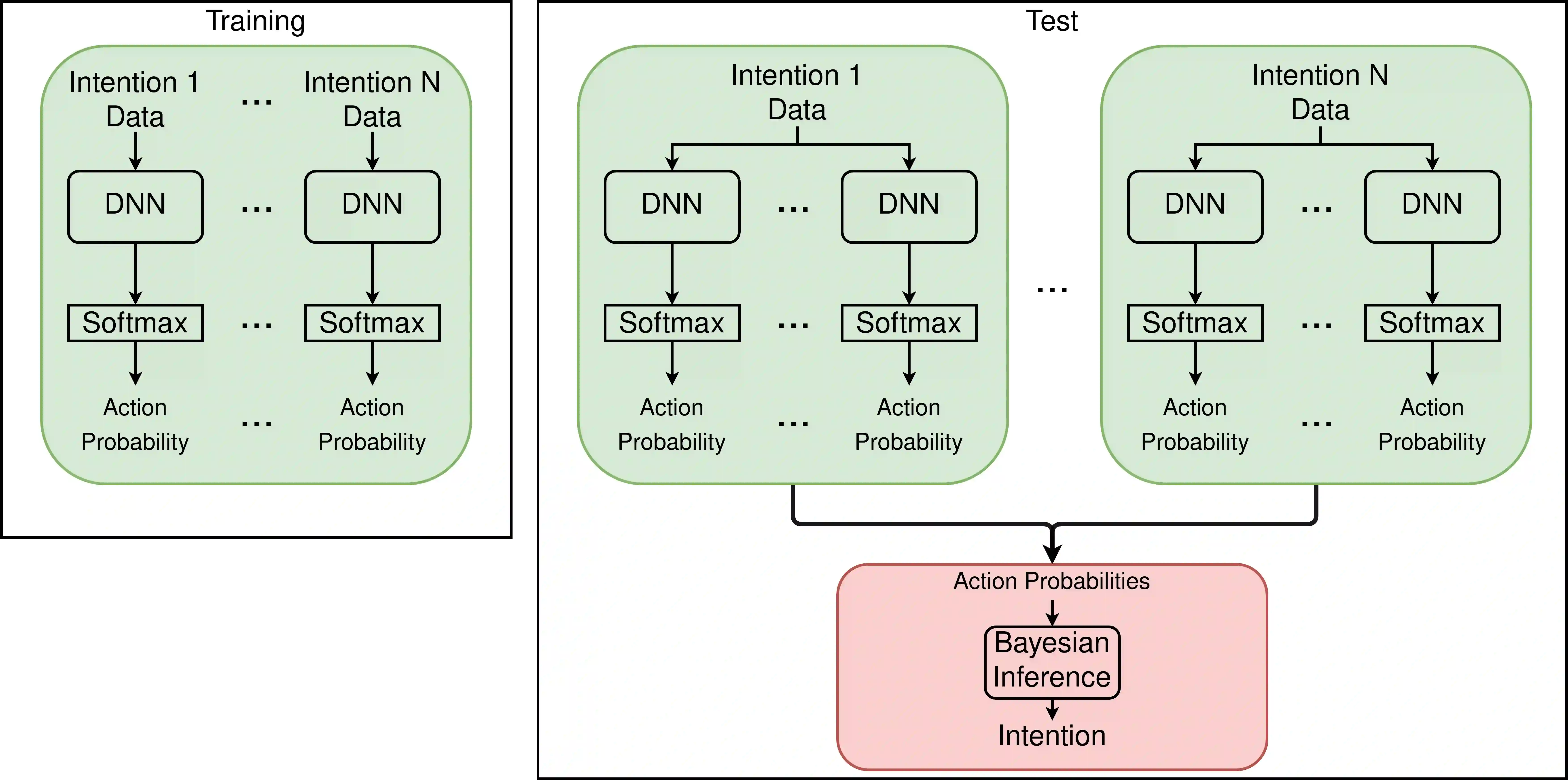 Predicting the next action that a human is most likely to perform is key to human-AI collaboration and has consequently attracted increasing research interests in recent years. An important factor for next action prediction are human intentions: If the AI agent knows the intention it can predict future actions and plan collaboration more effectively. Existing Bayesian methods for this task struggle with complex visual input while deep neural network (DNN) based methods do not provide uncertainty quantifications. In this work we combine both approaches for the first time and show that the predicted next action probabilities contain information that can be used to infer the underlying intention. We propose a two-step approach to human intention prediction: While a DNN predicts the probabilities of the next action, MCMC-based Bayesian inference is used to infer the underlying intention from these predictions. This approach not only allows for independent design of the DNN architecture but also the subsequently fast, design-independent inference of human intentions. We evaluate our method using a series of experiments on the Watch-And-Help (WAH) and a keyboard and mouse interaction dataset. Our results show that our approach can accurately predict human intentions from observed actions and the implicit information contained in next action probabilities. Furthermore, we show that our approach can predict the correct intention even if only few actions have been observed.