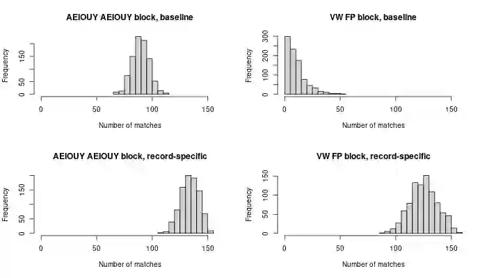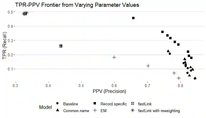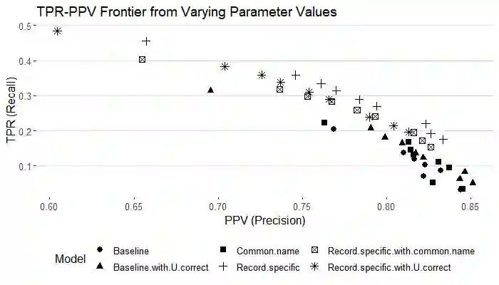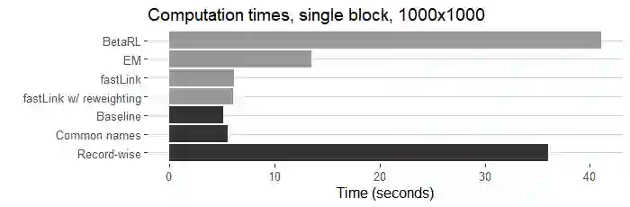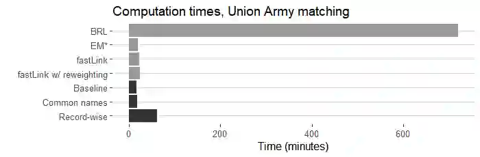 翻译:研究人员往往有兴趣将个人连接到两个缺乏共同独特识别特征的数据集之间。 匹配程序往往难以使记录与共同名称、出生地或其他字段值相匹配。 计算可行性也是一个挑战,特别是在连接大型数据集时。 我们开发了一种巴伊西亚自动概率记录连接方法,显示它回收了50%以上的真实匹配,保持准确性,比可比方法多出50%以上,将军事招募数据与1900年有专家标签匹配的美国普查相匹配。 我们的方法以最新最先进的巴伊西亚方法为基础,完善了比较数据的建模,允许以非匹配状态为条件的分歧概率参数在两个数据集的较小部分具有特定记录特性。这种灵活性在很多记录共享共同字段值时大大改进了匹配。 我们表明,我们的方法在实际中是可行的,尽管增加了复杂性,但R/C++的落实速度大大高于可比较的近期方法。 我们还建议一种较轻的处理非常常见名称的方法,并表明在无法真正匹配的情况下如何估计真实的积极率和积极预测值。