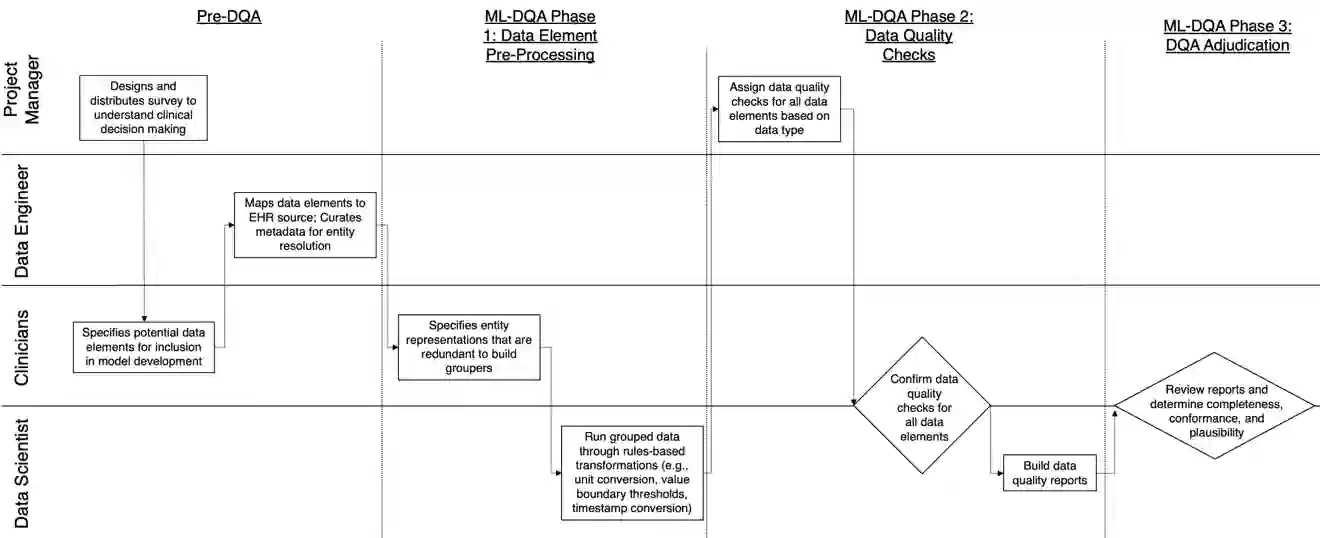 翻译:虽然临床研究人员谨慎地使用RWD进行临床调查,但医疗队的ML使用公共数据集,而很少仔细检查以开发新的算法;这项研究缩小了这一差距,开发并验证了以RWD最佳做法为基础的数据质量保证框架ML-DQA; ML-DQA框架适用于两个地理区、不同医疗条件和不同组群的五个ML项目;共为RWD在五个项目中收集了247 536名病人的2 999份质量检查和24份质量报告; 出现了五个一般性做法:所有项目都使用类似方法将冗余数据部分表述成群;所有项目都使用自动化公用事业来建立诊断和药物数据要素;所有项目都使用一个基于规则的变革共同图书馆;所有项目都采用统一的方法对数据要素进行数据质量检查;所有项目都采用类似的临床判断方法;平均5.8人,包括临床医生、数据科学家和受训人员,对RWD进行了质量检查; 每一个ML-D项目在实施MA基本内容时,每个ML-D项目都展示了ML-QA项目的重要性。
