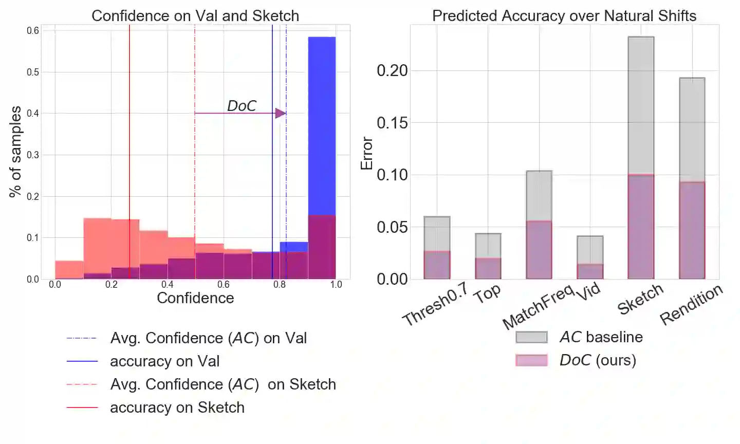 翻译:最近的工作表明,当根据分布接近但不同于培训分布的数据对模型的分布数据进行评估时,机器学习模型的性能可以大不相同。因此,预测无形分布的模型性能是一项重大挑战。我们的工作将领域适应和预测不确定性文献的技术联系起来,使我们能够预测挑战性无形分布的模型性能,而没有获得标签数据。在分布转移方面,分配距离常常被用来调整模型,改进新领域的性能,而精确估计或其他形式的预测性不确定性往往在这些调查中被忽视。通过调查各种既定的分布距离,例如Frechet距离或最大平均值偏差,我们确定这些模型未能产生对分布变化中的性能的可靠估计。另一方面,我们发现一个分类器预测的可信度差异(DoC)成功地估计了分类器在各种变化中的性能变化。我们特别调查合成和自然分布变化之间的区别,并观察到尽管DoC的简单程度持续超过对分布差异的其他量化,例如Frechet 距离或最大平均值偏差,我们确定它们未能产生可靠的对分布变化的可靠估计。另一方面,我们发现,一个分类器的预测值之间的信任差异通过现实化数据流差($) 和图像分布上几乎一半的预测错误。