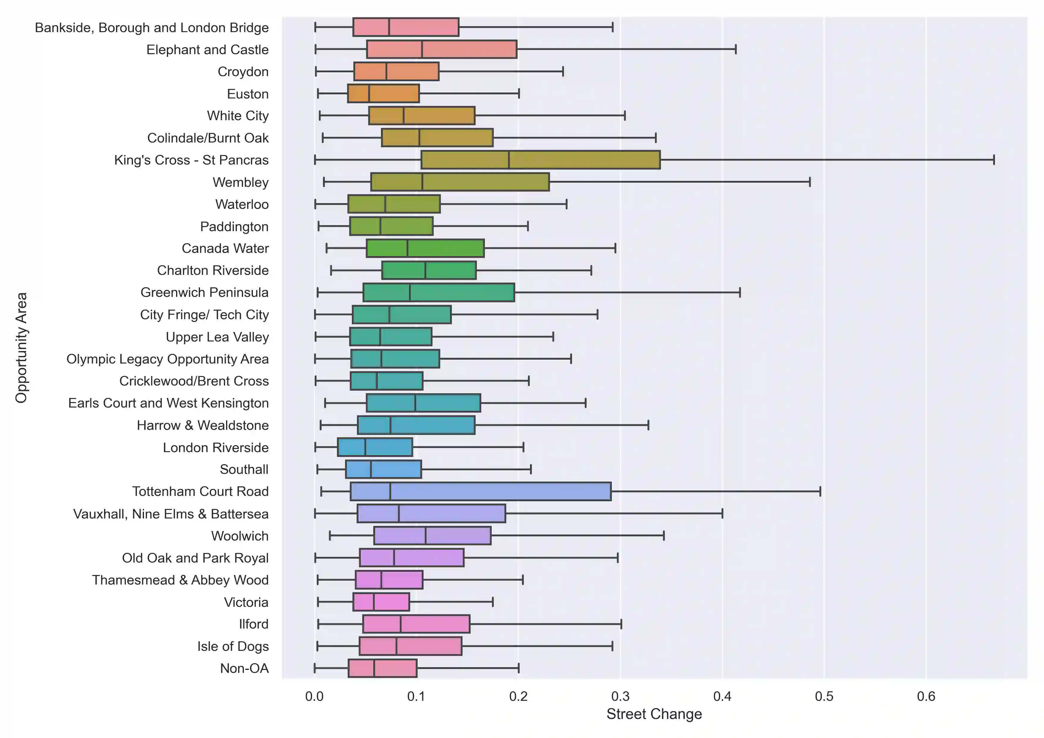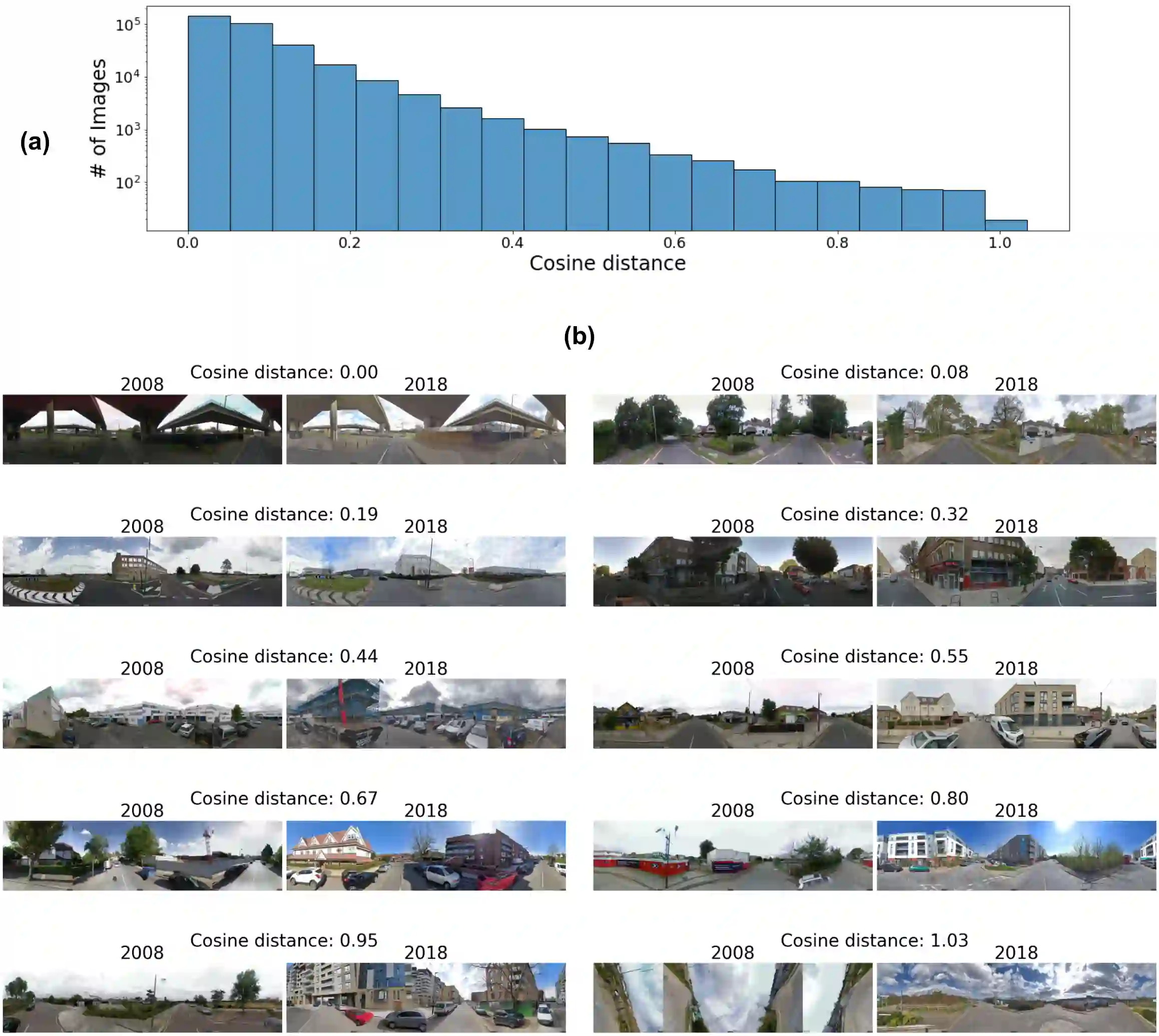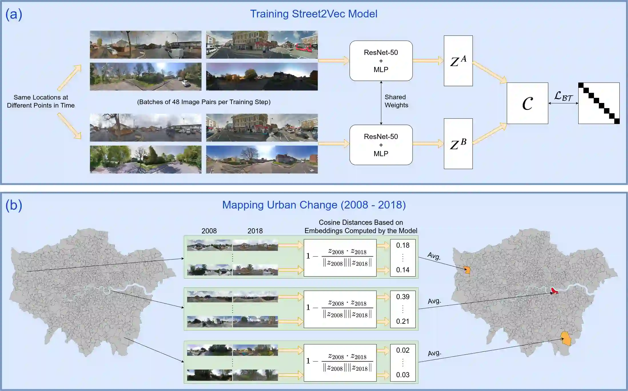 Cities around the world face a critical shortage of affordable and decent housing. Despite its critical importance for policy, our ability to effectively monitor and track progress in urban housing is limited. Deep learning-based computer vision methods applied to street-level images have been successful in the measurement of socioeconomic and environmental inequalities but did not fully utilize temporal images to track urban change as time-varying labels are often unavailable. We used self-supervised methods to measure change in London using 15 million street images taken between 2008 and 2021. Our novel adaptation of Barlow Twins, Street2Vec, embeds urban structure while being invariant to seasonal and daily changes without manual annotations. It outperformed generic embeddings, successfully identified point-level change in London's housing supply from street-level images, and distinguished between major and minor change. This capability can provide timely information for urban planning and policy decisions toward more liveable, equitable, and sustainable cities.