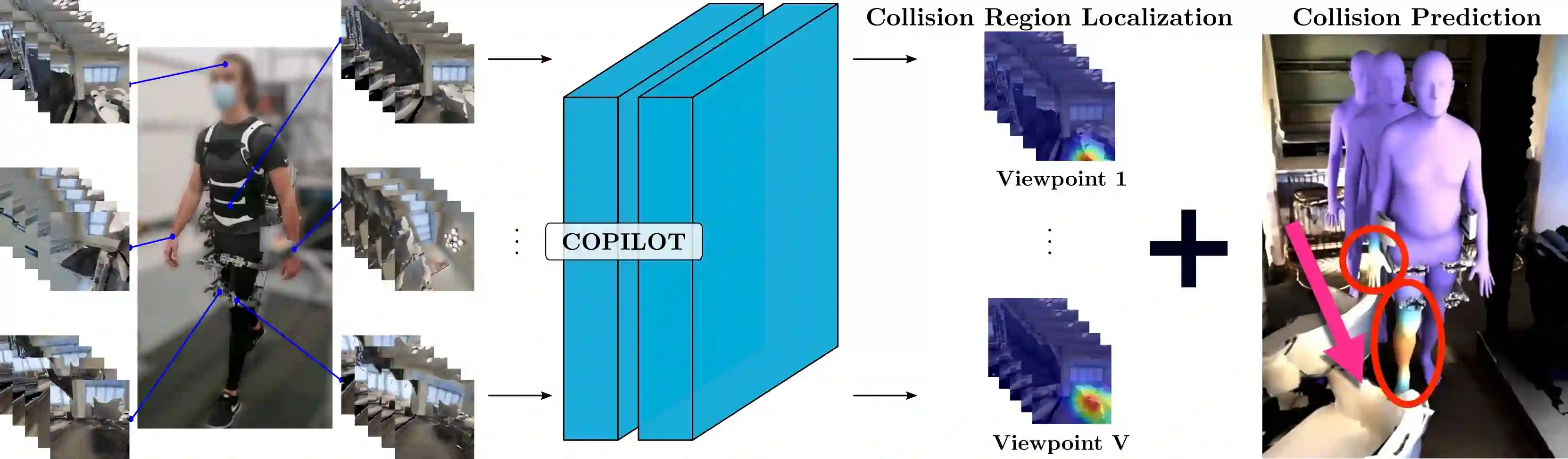 To produce safe human motions, assistive wearable exoskeletons must be equipped with a perception system that enables anticipating potential collisions from egocentric observations. However, previous approaches to exoskeleton perception greatly simplify the problem to specific types of environments, limiting their scalability. In this paper, we propose the challenging and novel problem of predicting human-scene collisions for diverse environments from multi-view egocentric RGB videos captured from an exoskeleton. By classifying which body joints will collide with the environment and predicting a collision region heatmap that localizes potential collisions in the environment, we aim to develop an exoskeleton perception system that generalizes to complex real-world scenes and provides actionable outputs for downstream control. We propose COPILOT, a video transformer-based model that performs both collision prediction and localization simultaneously, leveraging multi-view video inputs via a proposed joint space-time-viewpoint attention operation. To train and evaluate the model, we build a synthetic data generation framework to simulate virtual humans moving in photo-realistic 3D environments. This framework is then used to establish a dataset consisting of 8.6M egocentric RGBD frames to enable future work on the problem. Extensive experiments suggest that our model achieves promising performance and generalizes to unseen scenes as well as real world. We apply COPILOT to a downstream collision avoidance task, and successfully reduce collision cases by 29% on unseen scenes using a simple closed-loop control algorithm.