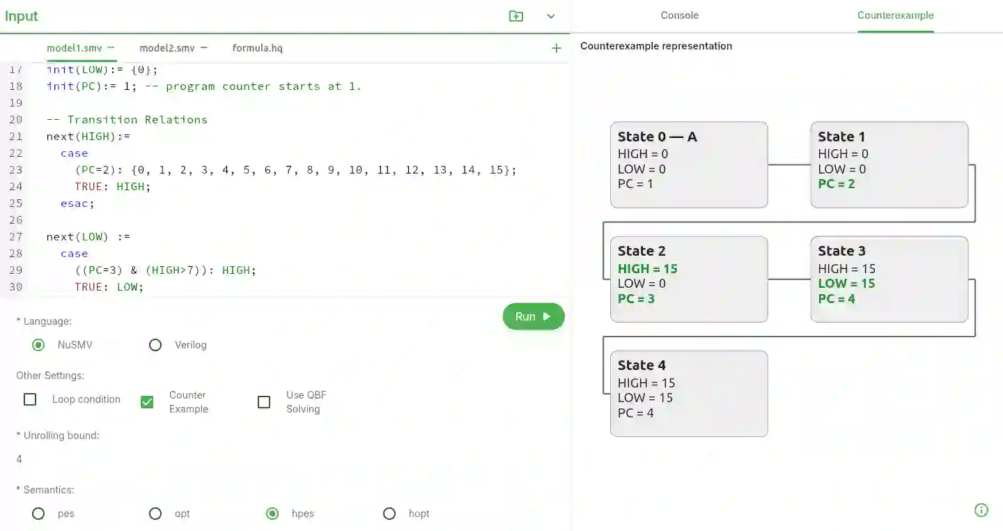 翻译:本文介绍工具HyperQB 2.0,这是首个高效的全自动有界模型检验器,专用于超属性验证。HyperQB以NuSMV或Verilog语言描述的模型及HyperLTL或A-HLTL时序逻辑公式作为输入。其核心决策过程基于SMT与QBF求解器,可实现对有限状态与无限状态程序的验证。该工具提供命令行、独立图形界面及基于Web的交互方式。根据用户选择的错误检测或综合模式,系统将返回反例实例或路径见证。本工具完全采用Rust语言实现,我们通过大量案例研究中的丰富实验,结合严格的性能对比分析与同类工具的比较,报告了成功且高效的模型检验结果。