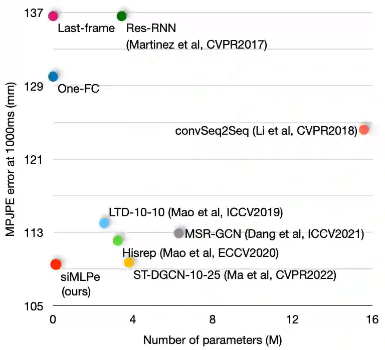 This paper tackles the problem of human motion prediction, consisting in forecasting future body poses from historically observed sequences. Despite of their performance, current state-of-the-art approaches rely on deep learning architectures of arbitrary complexity, such as Recurrent Neural Networks~(RNN), Transformers or Graph Convolutional Networks~(GCN), typically requiring multiple training stages and more than 3 million of parameters. In this paper we show that the performance of these approaches can be surpassed by a light-weight and purely MLP architecture with only 0.14M parameters when appropriately combined with several standard practices such as representing the body pose with Discrete Cosine Transform (DCT), predicting residual displacement of joints and optimizing velocity as an auxiliary loss. An exhaustive evaluation on Human3.6M, AMASS and 3DPW datasets shows that our method, which we dub siMLPe, consistently outperforms all other approaches. We hope that our simple method could serve a strong baseline to the community and allow re-thinking the problem of human motion prediction and whether current benchmarks do really need intricate architectural designs. Our code is available at \url{https://github.com/dulucas/siMLPe}.