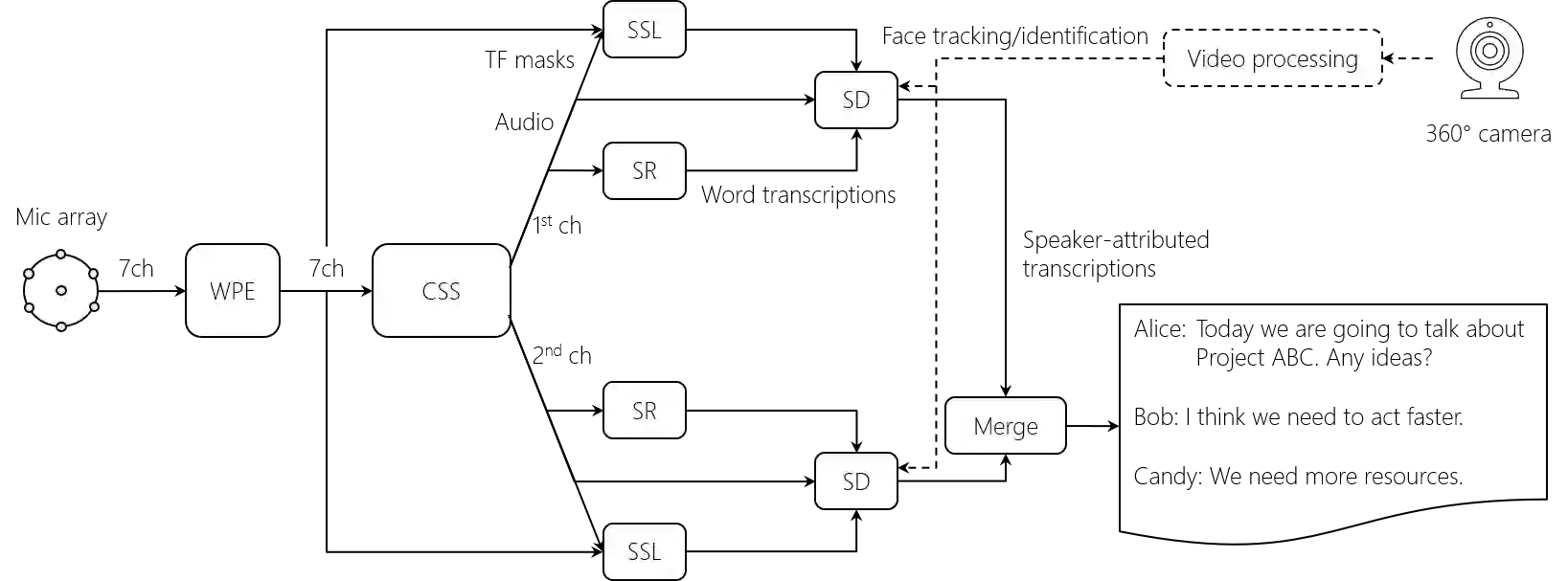 翻译:本文描述一个使用麦克风阵列和360度照相机生成配有语音注释的会议记录誊本的系统,该系统的特点是能够处理重叠的演讲,这在现实环境中已经是十多年来一个尚未解决的问题。我们表明,这个问题可以通过连续的语音分离方法加以解决。此外,我们描述了一种在线视听演讲的分化方法,该方法可以借助于跟踪和识别、声源本地化、发言者身份识别,以及如果有的话,预先的发言者信息,以稳健应对各种现实世界挑战。所有组成部分都被纳入一个称为SRD的会议记录框架,即SRD,它代表“分离、识别和分化”。 使用涉及多达11名与会者的自然会议的记录,来进行实验结果。连续的语音分离使单词错误率提高了16.1%,而光线显示高度调。如果有完整的与会人员名单,WER与发言者所属WER之间的差异仅为1.0%,表明“单词对发言人”协会的准确度为1.6%。当50%的参加者为未知时,这个系统将略增至1.6%。