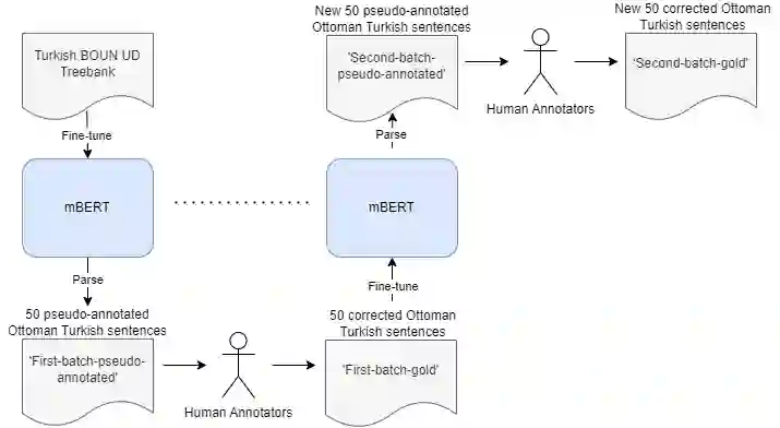 This study introduces a pretrained large language model-based annotation methodology for the first dependency treebank in Ottoman Turkish. Our experimental results show that, iteratively, i) pseudo-annotating data using a multilingual BERT-based parsing model, ii) manually correcting the pseudo-annotations, and iii) fine-tuning the parsing model with the corrected annotations, we speed up and simplify the challenging dependency annotation process. The resulting treebank, that will be a part of the Universal Dependencies (UD) project, will facilitate automated analysis of Ottoman Turkish documents, unlocking the linguistic richness embedded in this historical heritage.