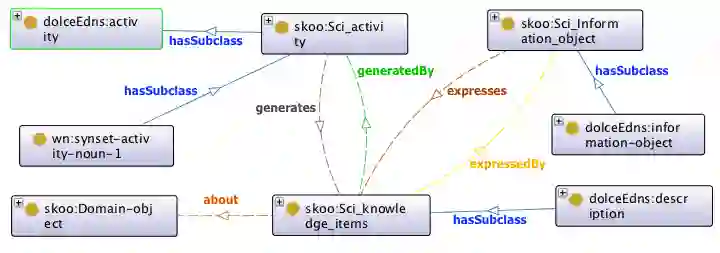 翻译:本文介绍的科学知识天体本体学的构建,是发展科学知识可视化方法的一部分,其动机是科学知识组织概念(理论、法律、经验、证据等)出现在现有的本体学中,但没有一个科学知识组织概念以这个主题为中心,是一个简单和容易使用的组织。我们介绍了由本体学来源(某些领域、法律及更高领域知识天体的自然学)、专门知识库和与科学家的访谈所建立的第一个版本。我们把这种本体学与使用的一些来源联系起来,使我们能够核查其与这些来源的一致性。对本体学的验证在于利用它将各种来源的知识正规化,我们已开始在物理领域这样做。