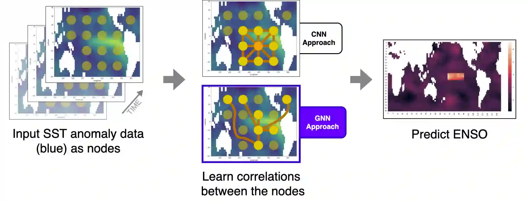 翻译:深层次的学习模型最近比预测厄尔尼诺-南方涛动(ENSO)等最先进的季节性预测模型效绩要强,但是,目前的深层次学习模型是以难以解释的进化神经网络为基础的,可能无法模拟称为远程连接的大规模大气模式,因此,我们提议在较长的周转时间、比目前最先进的方法更精细的颗粒性以及更好的预测技能上应用超模时时速图像神经网络(GNN)来预测厄尔尼诺/南方涛动(ENSO),而通过边缘进行信息流动的明确模型也可以进行更多的可解释的预测。初步结果对未来1个月和3个月预测来说是充满希望的,并且超越了最先进的艺术系统。