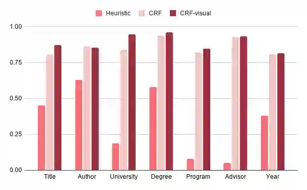 翻译:电子论文和文章(ETDs)包含可用于许多数字图书馆任务的域知识,如分析引用网络和预测研究趋势等。自动元数据提取对于建立可缩放的数字图书馆搜索引擎十分重要。大多数现有方法都是为天生数字文件设计的,因此它们往往无法从扫描文档中提取元数据,如ETDs。传统序列标记方法主要依靠基于文本的特征。在本文件中,我们提议一个有条件随机域模型,将文本和视觉特征结合起来。为了核实模型的稳健性,我们扩展了现有实体并创建了由500个ETD封面页和人类验证元数据组成的新的地面真相资料库。我们的实验显示,具有视觉特征的通用报告格式优于以文本为基础的模式。拟议的模型在七个元领域实现了81.3%-96%的F1措施。数据和源代码在谷歌驱动器(https://tinyurl.com/y8kzrwrp)和GitHub仓库(https://grustral_Erome.com/lam-slam-rwrum)上公开提供(httpsmaxxwn)。