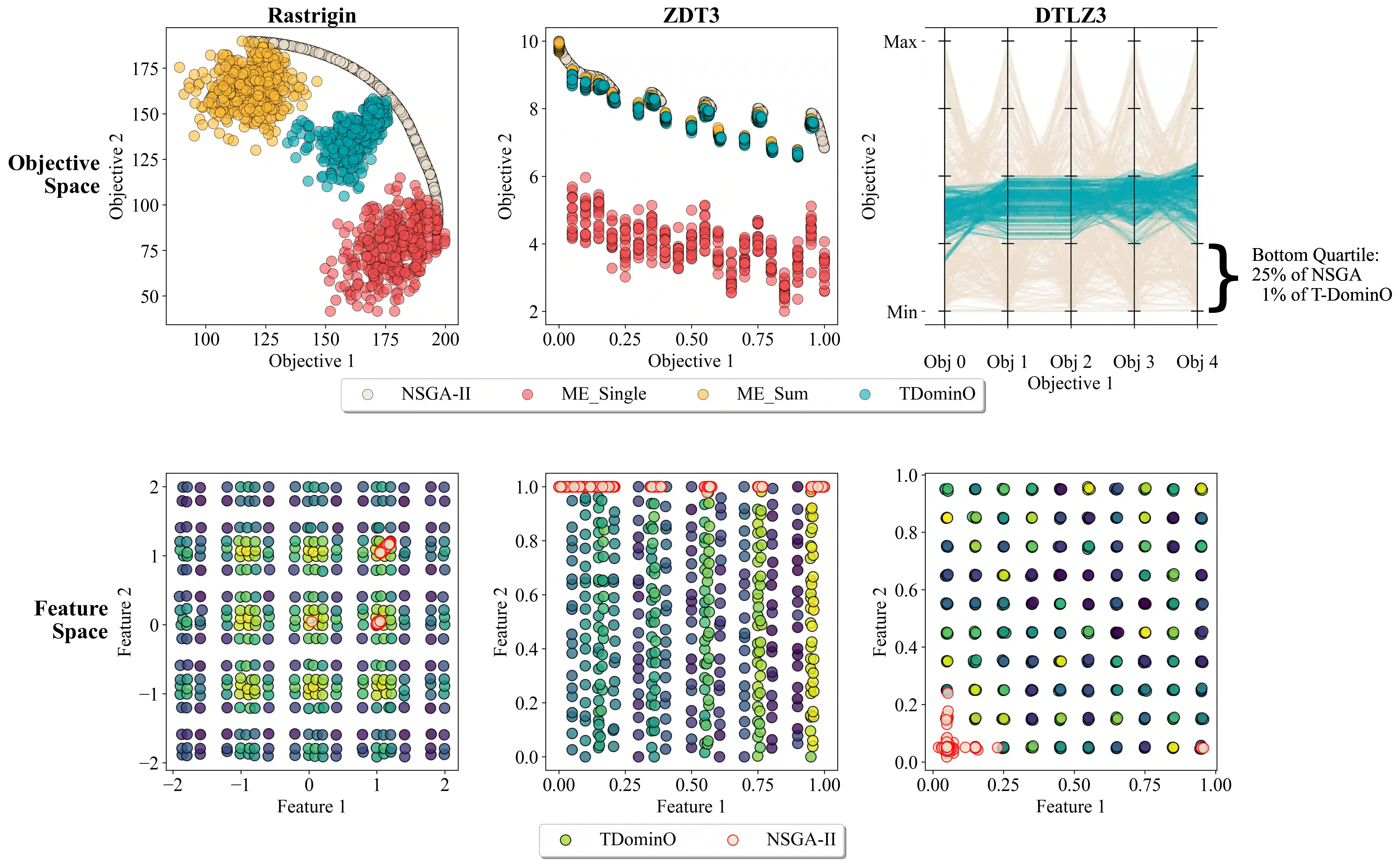 翻译:现实世界的设计问题是各种制约、目标和特征的杂乱组合。 探索这些问题空间可以被定义为多标准探索(MCX)问题,其目标是在很多目标中产生一套具有高性能的多样化解决方案,同时避免任何目标的低效。 质量- 多样性算法产生所需的设计差异,但通常只考虑一个单一的目标。 我们提出了一个新的排名,即T- DominO, 专门用来处理MCX问题中的多重目标。 T-DominO将个人排在档案中其他解决方案的排名中,有利于个人,使其业绩平衡,优于那些以其他成本为代价在少数目标上优于少数目标的人。 在每个MAP- Elites bin 中只保留一个单一的平衡解决方案, 保持对档案的可视性 -- -- 这是设计探索的强大资产。 我们展示了一套易于理解的基准, 并在一个多目标真实世界的案例研究中展示其潜力。