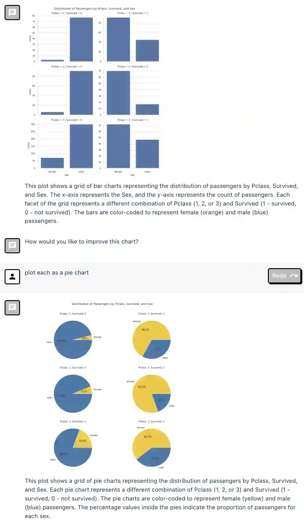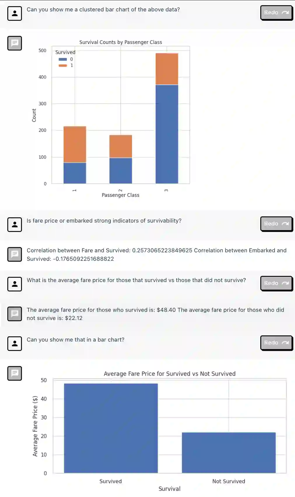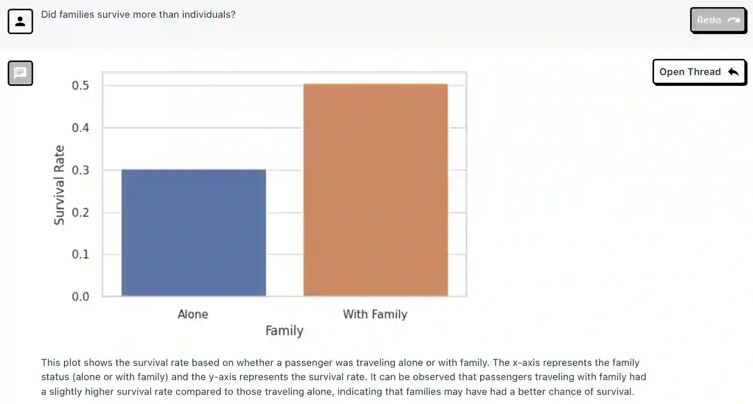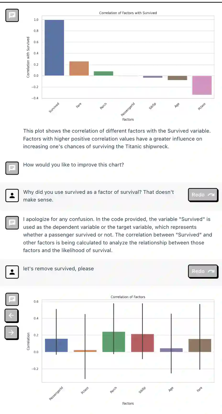 Generative Large Language Models (LLMs) show potential in data analysis, yet their full capabilities remain uncharted. Our work explores the capabilities of LLMs for creating and refining visualizations via conversational interfaces. We used an LLM to conduct a re-analysis of a prior Wizard-of-Oz study examining the use of chatbots for conducting visual analysis. We surfaced the strengths and weaknesses of LLM-driven analytic chatbots, finding that they fell short in supporting progressive visualization refinements. From these findings, we developed AI Threads, a multi-threaded analytic chatbot that enables analysts to proactively manage conversational context and improve the efficacy of its outputs. We evaluate its usability through a crowdsourced study (n=40) and in-depth interviews with expert analysts (n=10). We further demonstrate the capabilities of AI Threads on a dataset outside the LLM's training corpus. Our findings show the potential of LLMs while also surfacing challenges and fruitful avenues for future research.
