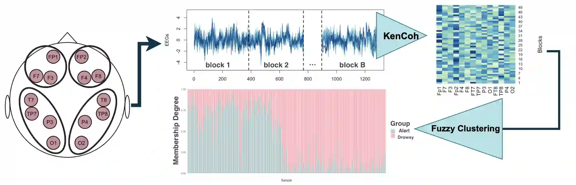 翻译:多元时间序列(MTS)的聚类因非平稳交叉依赖性、噪声污染以及状态边界渐变或重叠而具有挑战性。本文提出一种谱域鲁棒模糊聚类框架,利用基于Kendall tau的典型相干性提取跨变量的频率特异性单调关系。该方法基于主导频率的跨区域连接模式提升聚类精度,同时保持对异常值的鲁棒性,使其广泛适用于含噪声的高维MTS。每个序列被投影至由谱矩阵生成的向量上,该矩阵专为捕捉底层模糊划分而设计。数值实验表明本框架优于现有方法。作为典型应用,我们分析了脑电图记录,该方法揭示了潜在认知状态(如警觉与困倦)中频率与连接特异性的标志物,同时展现了判别性模式与模糊过渡状态。