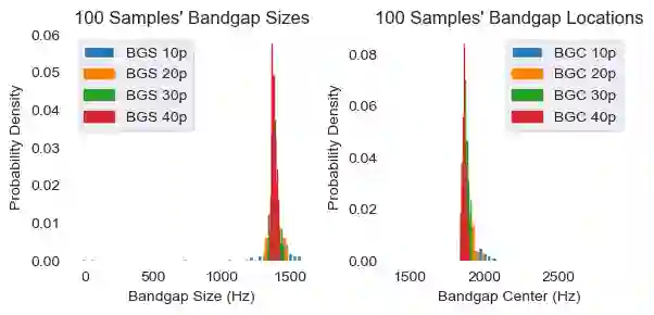 This paper studies the utility of techniques within uncertainty quantification, namely spectral projection and polynomial chaos expansion, in reducing sampling needs for characterizing acoustic metamaterial dispersion band responses given stochastic material properties and geometric defects. A novel method of encoding geometric defects in an interpretable, resolution independent is showcased in the formation of input space probability distributions. Orders of magnitude sampling reductions down to $\sim10^0$ and $\sim10^1$ are achieved in the 1D and 7D input space scenarios respectively while maintaining accurate output space probability distributions through combining Monte Carlo, quadrature rule, and sparse grid sampling with surrogate model fitting.