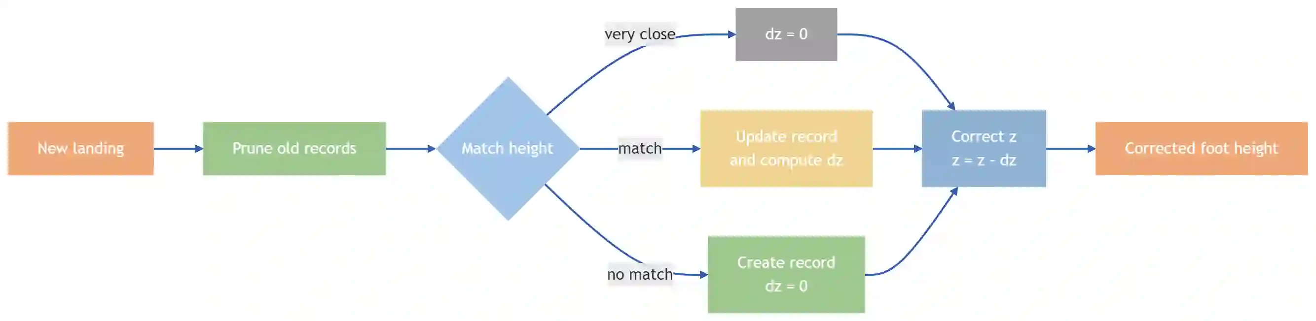 翻译:在无相机或激光雷达的情况下,为足式机器人提供可靠的里程计仍具挑战性,这主要源于IMU漂移和关节速度传感噪声。本文提出一种纯粹的本体感知状态估计器,仅使用IMU和电机测量值来联合估计机体位姿与速度,其统一框架适用于双足、四足及轮腿式机器人。核心思想是将每条接触腿视为一个运动学锚点:基于关节力矩的足端力估计用于筛选可靠接触,相应的足落点位置则提供间歇性的世界坐标系约束,从而抑制长期漂移。为防止在长距离行进中出现高度漂移,我们引入一种轻量级的高度聚类与时间衰减校正方法,将新记录的足落点高度对齐到先前观测到的支撑平面。为改善编码器量化下的足端速度观测,我们应用一种逆运动学容积卡尔曼滤波器,直接从关节角度和速度中滤波估计足端速度。该实现进一步通过多接触几何一致性缓解偏航角漂移,并在IMU偏航约束不可用或不可靠时,优雅地退化为基于运动学的航向参考。我们在四个四足机器人平台(三个Astrall机器人和一个Unitree Go2 EDU)上使用闭环轨迹评估了该方法。在Astrall点足机器人A上,约200米水平环路和约15米垂直环路的误差分别为0.1638米和0.219米;在轮腿式机器人B上,相应误差为0.2264米和0.199米。在轮腿式机器人C上,约700米水平环路产生7.68米误差,约20米垂直环路产生0.540米误差。Unitree Go2 EDU在约120米水平环路中产生2.2138米误差,在约8米垂直环路中垂直误差小于0.1米。github.com/ShineMinxing/Ros2Go2Estimator.git