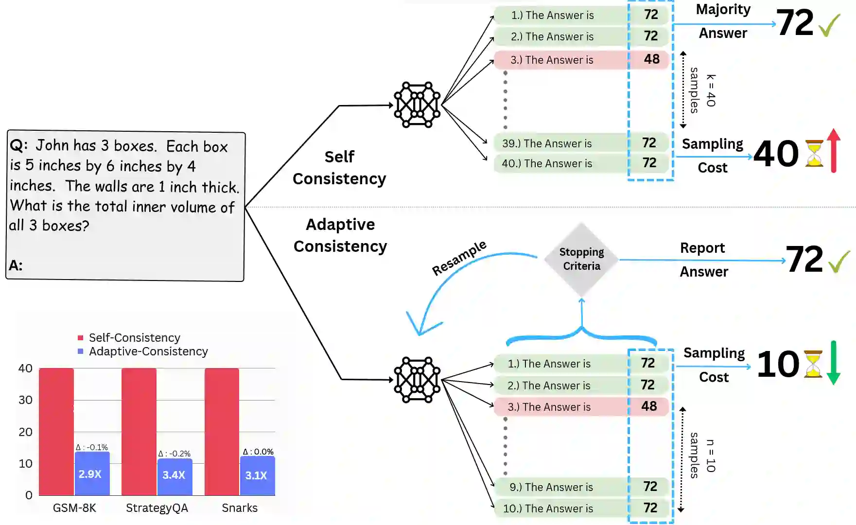 A popular approach for improving the correctness of output from large language models (LLMs) is Self-Consistency - poll the LLM multiple times and output the most frequent solution. Existing Self-Consistency techniques always draw a constant number of samples per question, where a better approach will be to non-uniformly distribute the available budget based on the amount of agreement in the samples drawn so far. In response, we introduce Adaptive-Consistency, a cost-efficient, model-agnostic technique that dynamically adjusts the number of samples per question using a lightweight stopping criterion. Our experiments over 13 datasets and two LLMs demonstrate that Adaptive-Consistency reduces sample budget by up to 6.0 times with an average accuracy drop of less than 0.1%.