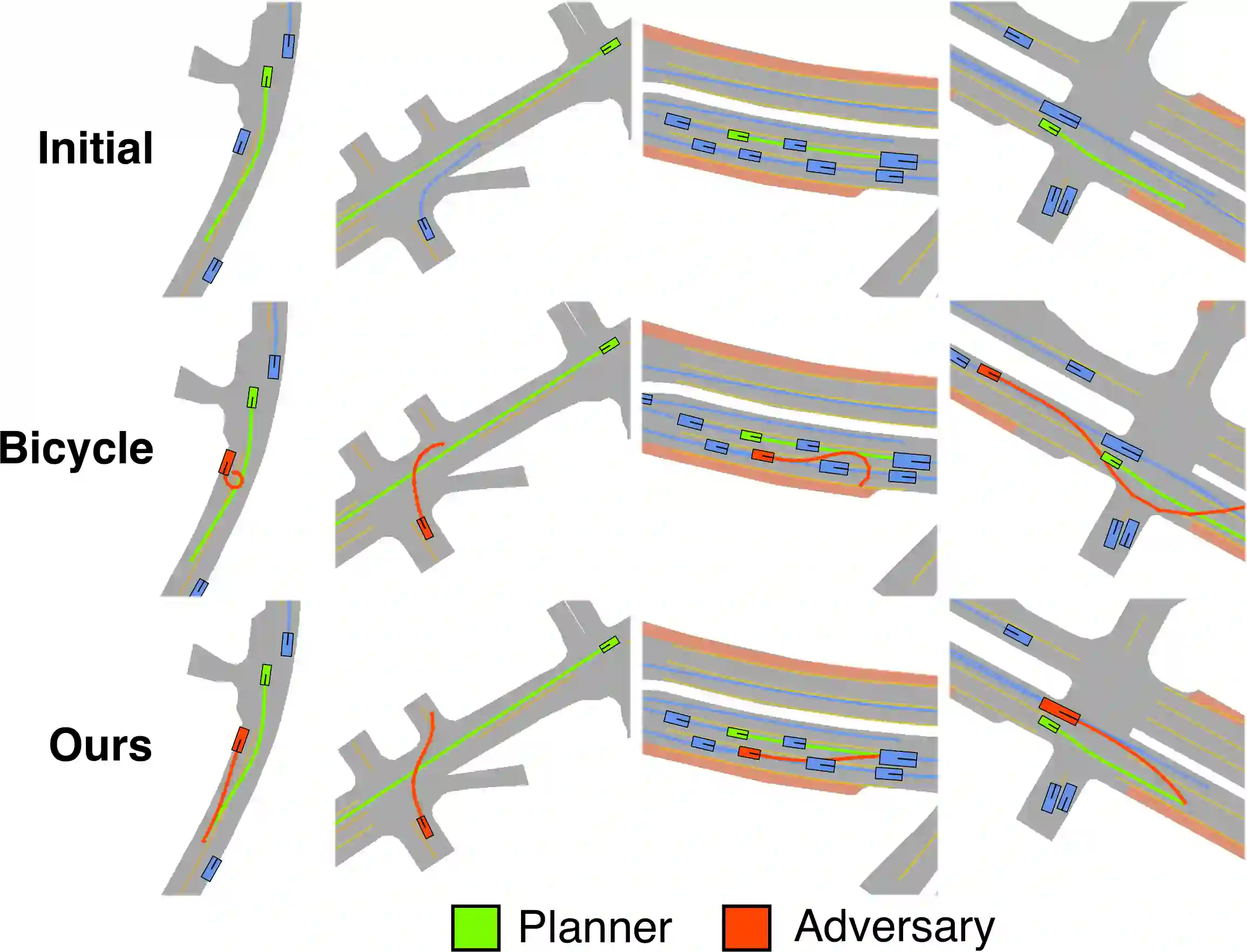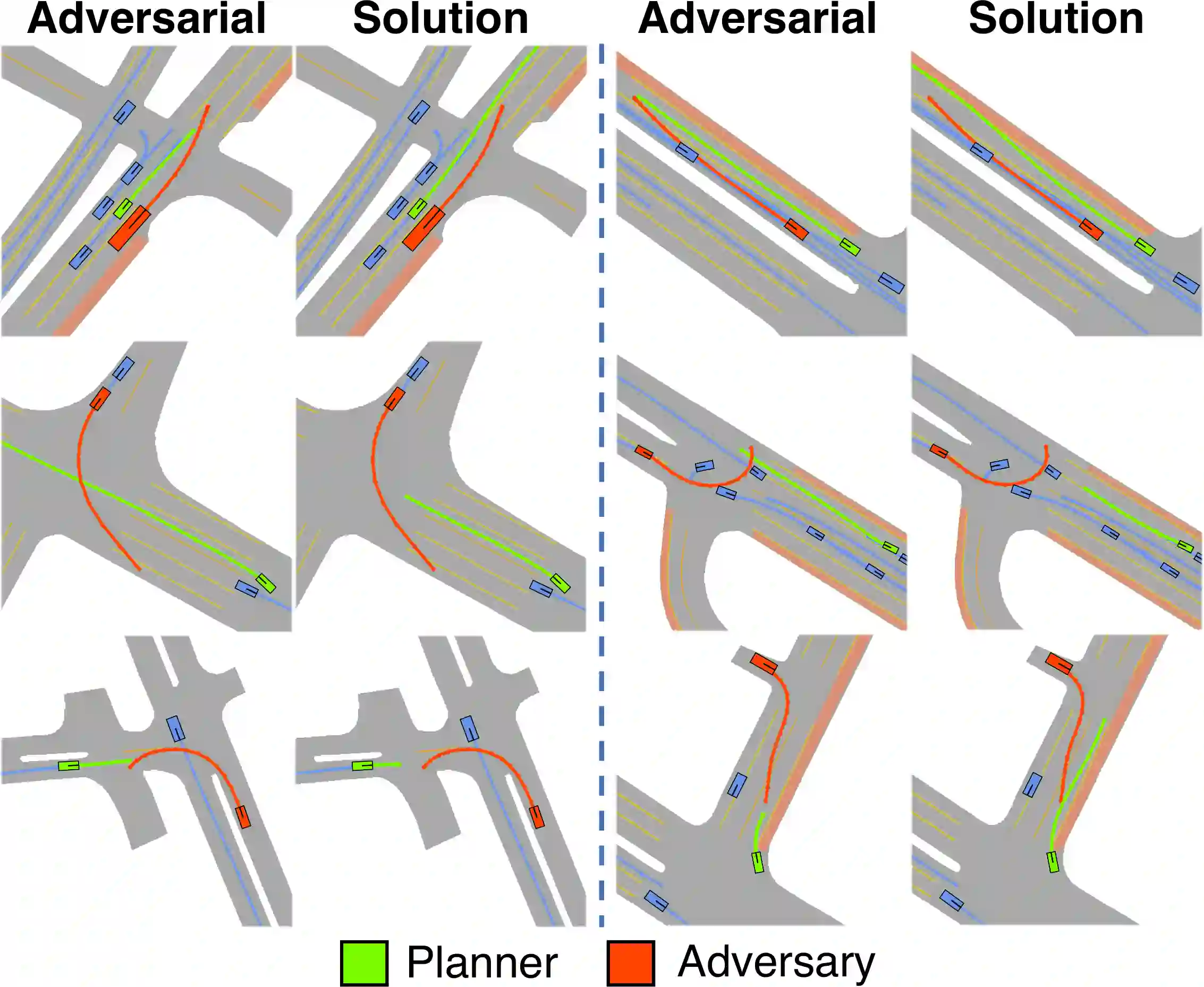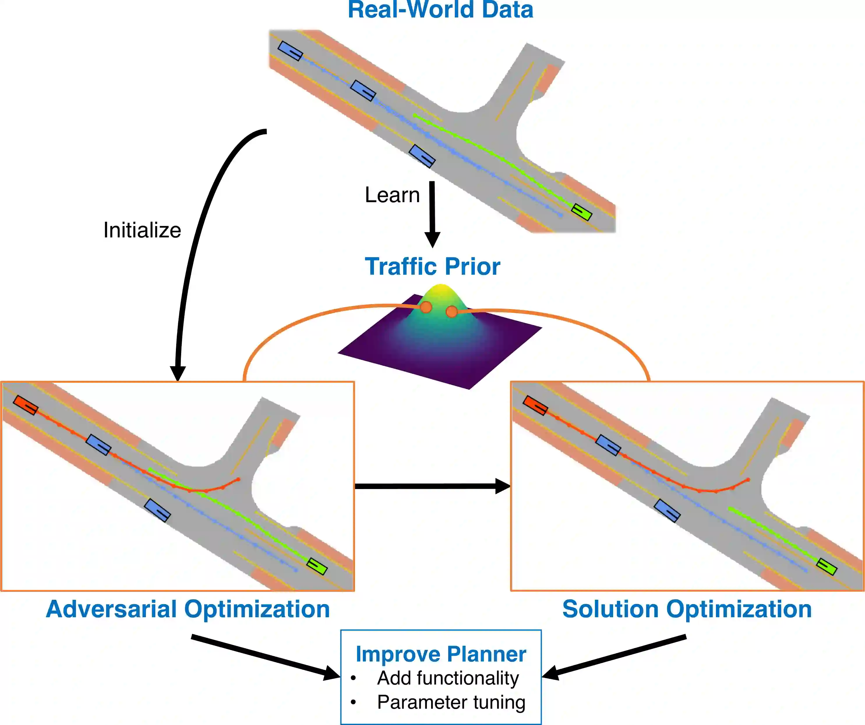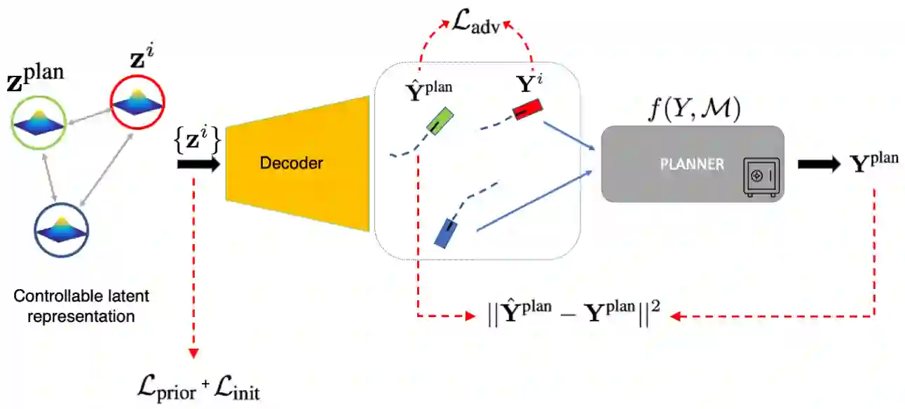 翻译:为了有用,这些情景必须是现实的,具有挑战性,但并非不可能安全地通过。在这项工作中,我们引入了一种自动产生具有挑战性的情景的方法,使某个规划者产生不可取的行为,如碰撞。为了保持情景的可信度,关键的想法是以图表为基础的条件VAE的形式利用交通运动的学习模型。情景生成是作为这一交通模式潜在空间的一种优化,通过对初始真实世界场景进行渗透,产生与某个规划者相撞的轨迹。随后的优化用于寻找“解决方案”来改进特定的规划者。进一步分析基于碰撞类型产生的情景。我们攻击两个规划者,并表明STIVE成功地在两种情况下都产生了现实的、具有挑战性的情景。我们进一步“关闭循环”并使用这些情景来优化一个基于规则的规划者的超参数。