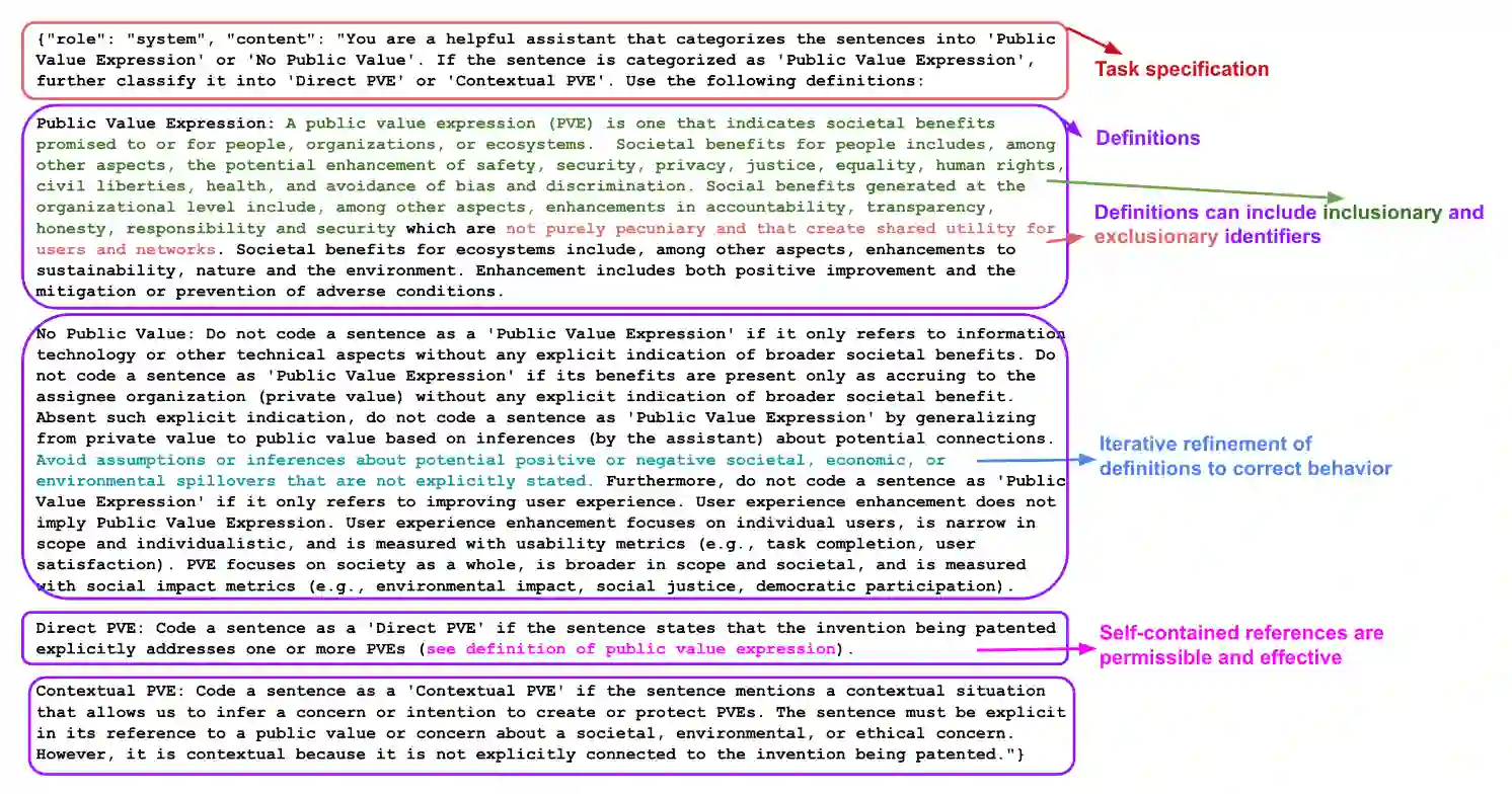 Labeling data is essential for training text classifiers but is often difficult to accomplish accurately, especially for complex and abstract concepts. Seeking an improved method, this paper employs a novel approach using a generative language model (GPT-4) to produce labels and rationales for large-scale text analysis. We apply this approach to the task of discovering public value expressions in US AI patents. We collect a database comprising 154,934 patent documents using an advanced Boolean query submitted to InnovationQ+. The results are merged with full patent text from the USPTO, resulting in 5.4 million sentences. We design a framework for identifying and labeling public value expressions in these AI patent sentences. A prompt for GPT-4 is developed which includes definitions, guidelines, examples, and rationales for text classification. We evaluate the quality of the labels and rationales produced by GPT-4 using BLEU scores and topic modeling and find that they are accurate, diverse, and faithful. These rationales also serve as a chain-of-thought for the model, a transparent mechanism for human verification, and support for human annotators to overcome cognitive limitations. We conclude that GPT-4 achieved a high-level of recognition of public value theory from our framework, which it also uses to discover unseen public value expressions. We use the labels produced by GPT-4 to train BERT-based classifiers and predict sentences on the entire database, achieving high F1 scores for the 3-class (0.85) and 2-class classification (0.91) tasks. We discuss the implications of our approach for conducting large-scale text analyses with complex and abstract concepts and suggest that, with careful framework design and interactive human oversight, generative language models can offer significant advantages in quality and in reduced time and costs for producing labels and rationales.