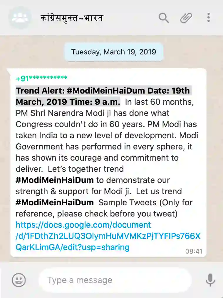 翻译:世界各地的政治组织不断创新使用社交媒体技术。在这里,我们记录了印度2019年大选中用于操纵推特趋势的技术和组织形式的新组合。组织者依靠一个庞大的“WhessApp”团体网络来协调松散的政治支持者的群众布局。为了调查这些运动,我们加入了支持赢得大选的右翼政党“Bharatiya Janata党”的600多个政治“WhesApp”团体。我们发现了75个标签操纵运动的直接证据,包括动员信息和预写推文清单。我们估计了这些运动的规模以及它们是否成功地创造了受控制的社交媒体叙事。我们显示,这些运动的规模小于媒体报道所显示的内容;它们仍然可靠地利用松散支持者的声音制作了“Twitter”趋势。中央控制但自愿参与的这一运动新组合使得关于合法使用数字工具参与政治参与的辩论复杂化。它可能为一个得到民众支持的政党的参与性媒体操纵提供了蓝图。