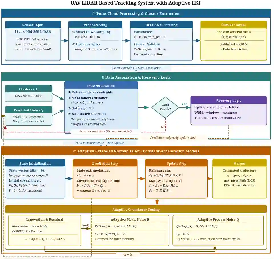 Accurate relative positioning is crucial for swarm aerial robotics, enabling coordinated flight and collision avoidance. Although vision-based tracking has been extensively studied, 3D LiDAR-based methods remain underutilized despite their robustness under varying lighting conditions. Existing systems often rely on bulky, power-intensive sensors, making them impractical for small UAVs with strict payload and energy constraints. This paper presents a lightweight LiDAR-based UAV tracking system incorporating an Adaptive Extended Kalman Filter (AEKF) framework. Our approach effectively addresses the challenges posed by sparse, noisy, and nonuniform point cloud data generated by non-repetitive scanning 3D LiDARs, ensuring reliable tracking while remaining suitable for small drones with strict payload constraints. Unlike conventional filtering techniques, the proposed method dynamically adjusts the noise covariance matrices using innovation and residual statistics, thereby enhancing tracking accuracy under real-world conditions. Additionally, a recovery mechanism ensures continuity of tracking during temporary detection failures caused by scattered LiDAR returns or occlusions. Experimental validation was performed using a Livox Mid-360 LiDAR mounted on a DJI F550 UAV in real-world flight scenarios. The proposed method demonstrated robust UAV tracking performance under sparse LiDAR returns and intermittent detections, consistently outperforming both standard Kalman filtering and particle filtering approaches during aggressive maneuvers. These results confirm that the framework enables reliable relative positioning in GPS-denied environments without the need for multi-sensor arrays or external infrastructure.
