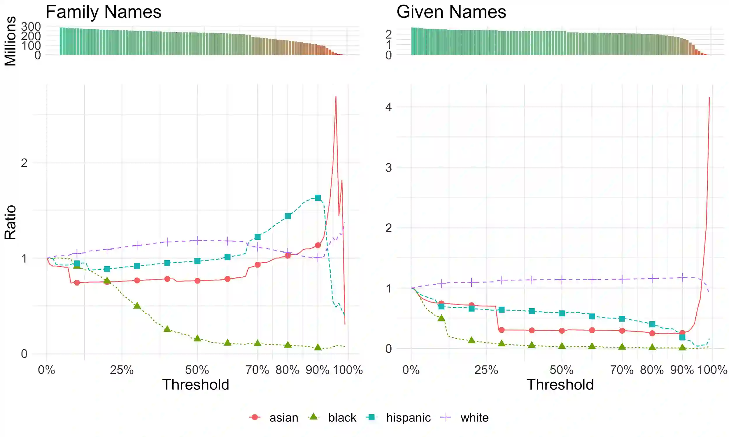 翻译:学术界的种族差异是一个广泛公认的问题。对基于种族的系统性种族不平等的定量理解是迈向更公平研究制度的一个重要步骤。然而,由于缺乏关于作者种族的可靠信息,因此,很少对这一专题进行大规模分析。分析方法提供了一种解决办法,利用关于作者的已知信息,例如他们的姓名,推断他们认为的种族。与任何其他算法一样,种族推论过程如果不仔细考虑,就会产生偏见。本文章的目的是评估算法偏见在多大程度上采用不同方法来进行基于种族的推论。我们利用美国人口普查和抵押申请中的信息来推断科学网中的美国附属作者的种族。我们估计了使用特定名称和家族名称、阈值或连续分布以及估算的影响。我们的结果表明,基于名称推论的有效性因种族/族裔特征而不同,而且这一阈值会低估黑人作者和高估白人作者。我们最后提出了避免潜在偏见的建议。这一文章为更系统和较少偏差地调查科学中的种族差距奠定了基础。