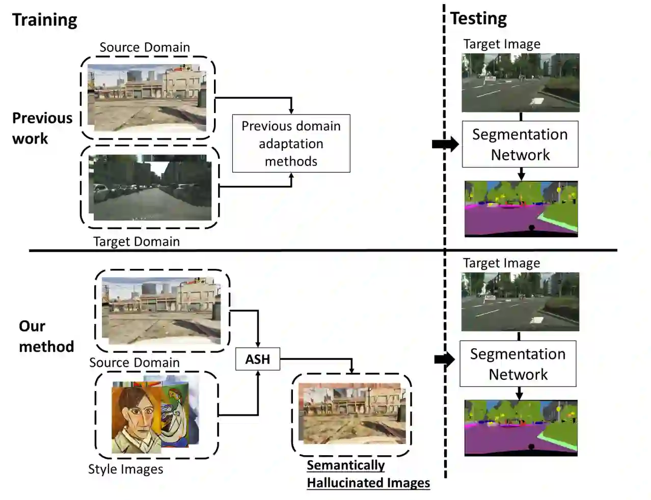 Convolutional neural networks may perform poorly when the test and train data are from different domains. While this problem can be mitigated by using the target domain data to align the source and target domain feature representations, the target domain data may be unavailable due to privacy concerns. Consequently, there is a need for methods that generalize well without access to target domain data during training. In this work, we propose an adversarial hallucination approach, which combines a class-wise hallucination module and a semantic segmentation module. Since the segmentation performance varies across different classes, we design a semantic-conditioned style hallucination layer to adaptively stylize each class. The classwise stylization parameters are generated from the semantic knowledge in the segmentation probability maps of the source domain image. Both modules compete adversarially, with the hallucination module generating increasingly 'difficult' style images to challenge the segmentation module. In response, the segmentation module improves its performance as it is trained with generated samples at an appropriate class-wise difficulty level. Experiments on state of the art domain adaptation work demonstrate the efficacy of our proposed method when no target domain data are available for training.