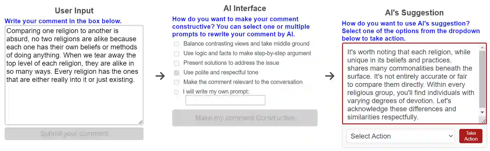 This paper examines how large language models (LLMs) can help people write constructive comments in online debates on divisive social issues and whether the notions of constructiveness vary across cultures. Through controlled experiments with 600 participants from India and the US, who reviewed and wrote constructive comments on online threads on Islamophobia and homophobia, we found potential misalignment in how LLMs and humans perceive constructiveness in online comments. While the LLM was more likely to view dialectical comments as more constructive, participants favored comments that emphasized logic and facts more than the LLM did. Despite these differences, participants rated LLM-generated and human-AI co-written comments as significantly more constructive than those written independently by humans. Our analysis also revealed that LLM-generated and human-AI co-written comments exhibited more linguistic features associated with constructiveness compared to human-written comments on divisive topics. When participants used LLMs to refine their comments, the resulting comments were longer, more polite, positive, less toxic, and more readable, with added argumentative features that retained the original intent but occasionally lost nuances. Based on these findings, we discuss ethical and design considerations in using LLMs to facilitate constructive discourse online.