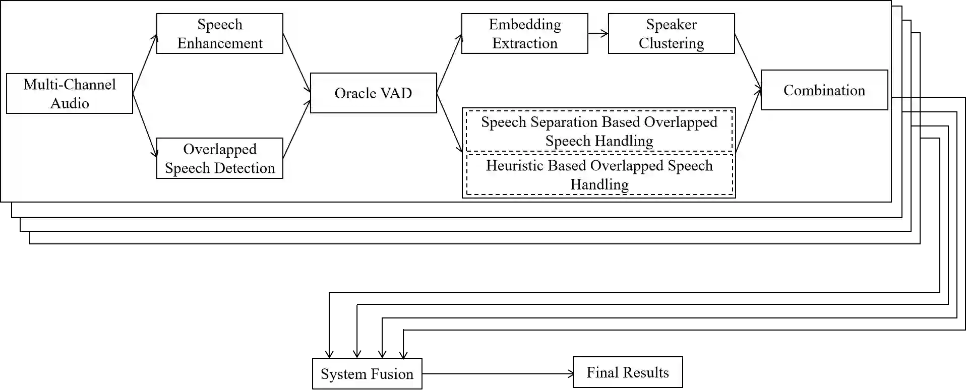 翻译:本文介绍了提交多频道多党会议分流挑战(M2MET)的皇家脸红色扬声器分化系统。我们的系统包括语音增强、语音探测重叠、语音嵌入提取、发言者群集、语音分离和系统融合。在这个系统中,我们做出了三项贡献。首先,我们提出了一个将多频道和基于U-Net的模型相结合的结构,目的是利用这两个单个结构的好处,进行远方重叠语音检测。第二,为了利用重叠语音检测模型帮助发言者分化,提出了基于语音分解的重叠语音处理方法,进一步应用了语音校验技术。第三,我们探索了三个发言者嵌入方法,并在CNCeleb-E测试集上获得了最先进的表现。有了这些提议,我们最好的单个系统将DER从15.25%大幅降至6.40%,而四个系统的组合最终在远场Alimeeting评价集中实现了6.30%的DER。