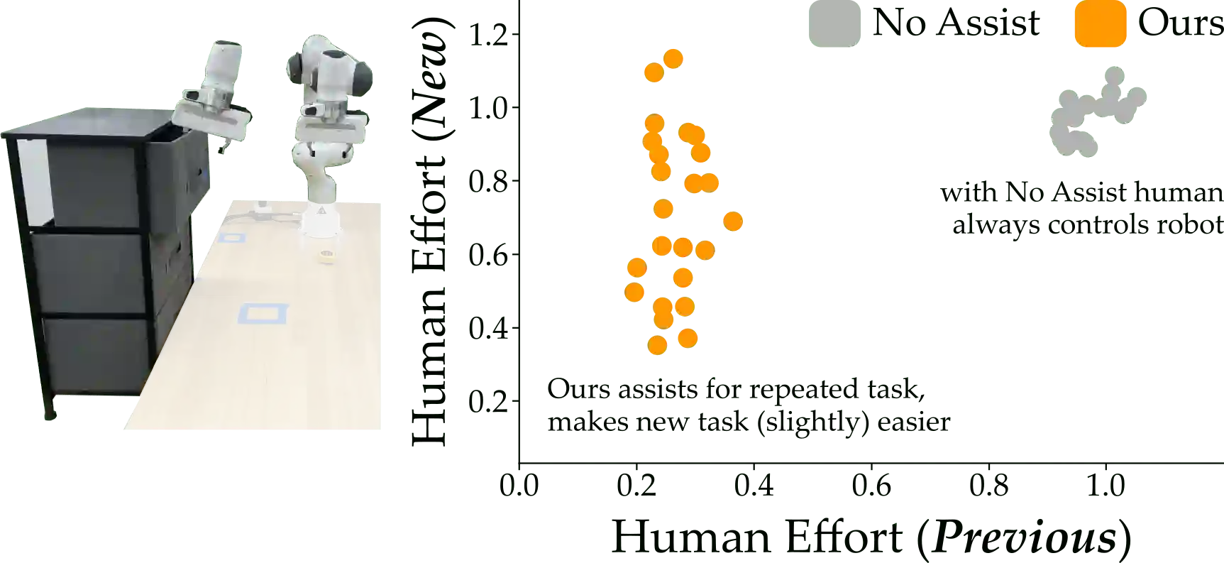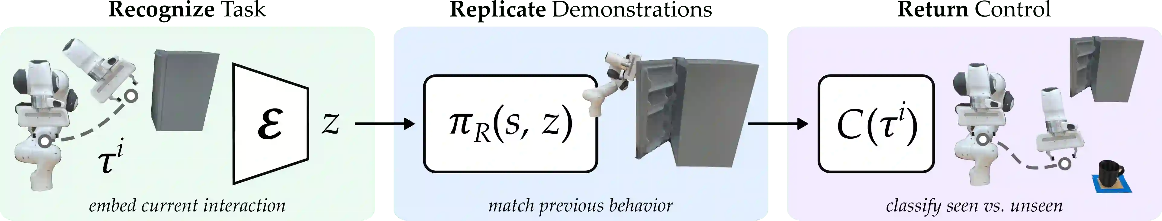 翻译:轮椅上架起的机器人臂(和其他辅助机器人)应该帮助其用户完成日常任务。机器人可以提供这种协助的方式之一是共享自主。在共享自主性的范围内,人类和机器人都可以在共享自主性的范围内对机器人的运动保持控制:随着机器人变得有信心,它可以理解人类想要的东西,它会越来越多地干预任务自动化。但是机器人如何知道人类可能想要执行什么任务呢?今天的共享自主性方法通常取决于先前的知识:例如,机器人必须先先行地了解一套可能的人类自主性。然而,从长远来看,这种先前的知识将不可避免地破碎 -- -- 迟早人类会达到机器人无法预料的目标。在这个文件中,我们提出一个共享自主性的学习方法,利用反复的互动。如果人类每次互动都执行完全不同的任务,那么学习帮助人类是不可能做到的。但是我们的见解是,身体残疾的用户每天重复重要的任务(例如,打开户头,打开户头,煮咖啡,吃晚宴)。我们引入了一种利用这些反复互动性的算法来认识用户的任务,不断学习机器人的任务,不断复制的演示任务。这些任务包括:不断学习的机器人任务,不断学习的技巧。