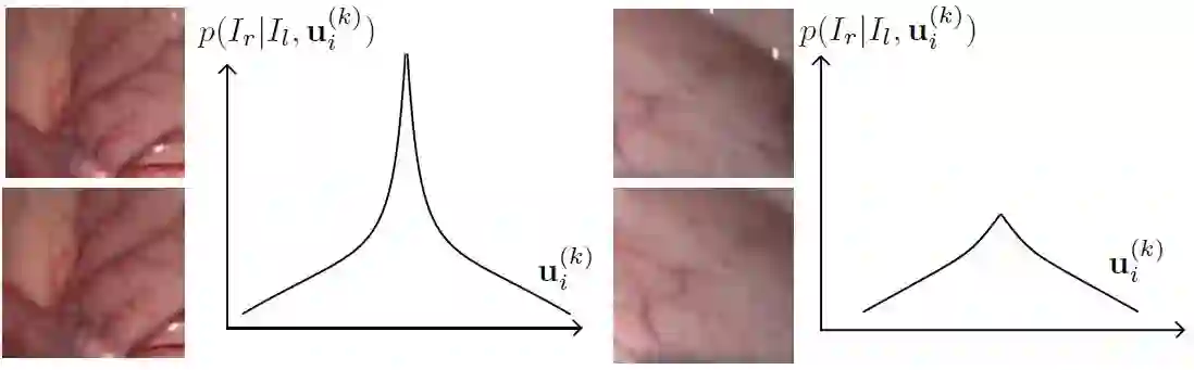 翻译:本文报告了外科图像的CPU级实时立体匹配方法( 10 Hz, 640 * 480 图像, 单核为 i5- 9400 ) 。 提议的方法建在快速“ 强烈反向搜索” 算法上, 该算法估计立体图像的差异。 相重叠的图像补丁( 任意正方形图像段) 根据光度一致性假设对不同比例图像进行校正。 我们提出贝叶西亚框架, 以评价在不同比例上优化补丁差的概率。 此外, 我们引入了空间高斯混合概率分布, 以解决补丁中的像素顺差概率。 校内和合成实验显示, 我们的方法可以处理无纹表面产生的模糊性, 以及Lambertian反射造成的光度不一致性。 我们的巴伊斯方法正确平衡了不同比例上立体图像的补丁的概率。 实验显示, 估计深度比外科情景中的基线法更准确, 外差也更少。