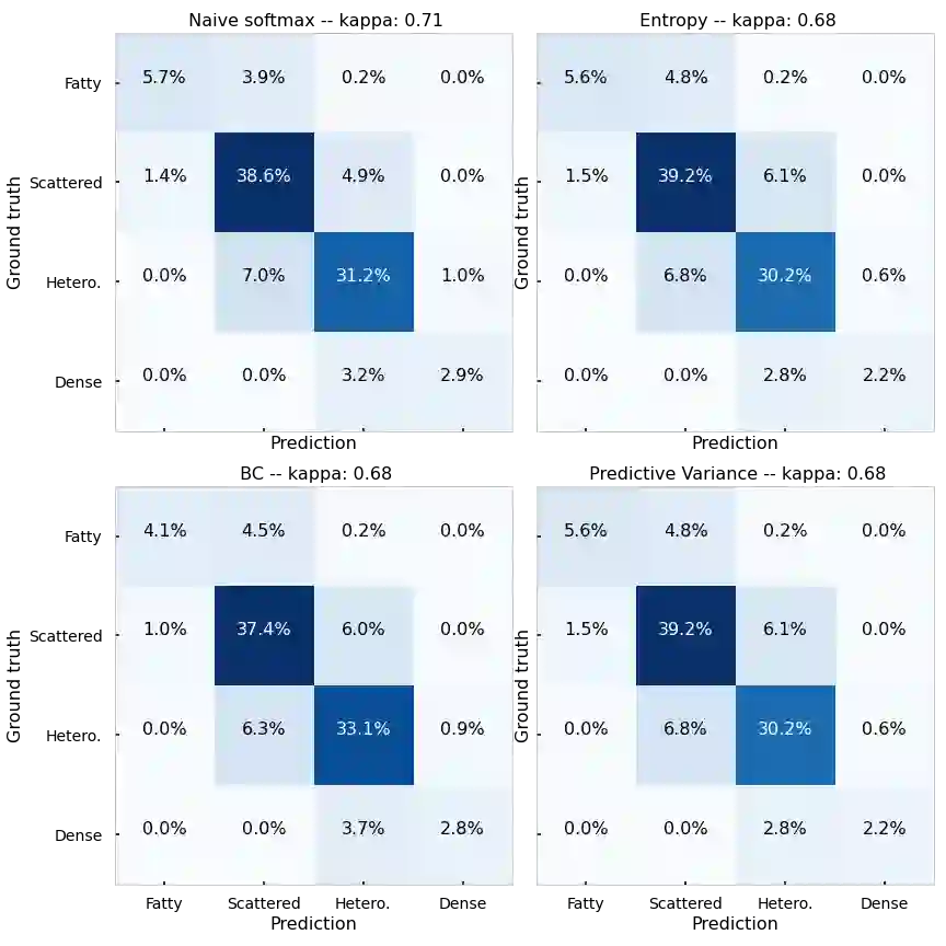 翻译:由于机器学习(ML)继续被纳入影响临床决策的保健系统,需要纳入新的战略,以便有效检测和评价分组差异,确保临床工作流程的问责制和可普遍性,在本文件中,我们探讨如何利用认知不确定性来评价病人人口(种族)和数据采集(扫描)分组的差异,以便评估在33个临床地点收集的108 190个乳房X光片数据集中的乳房密度。我们的结果表明,即使总体性能具有可比性,不确定性量化指标的选择也能够大大加强分组一级。我们希望这一分析能够推动进一步开展工作,研究如何利用不确定性提高临床部署机器学习应用的透明度。