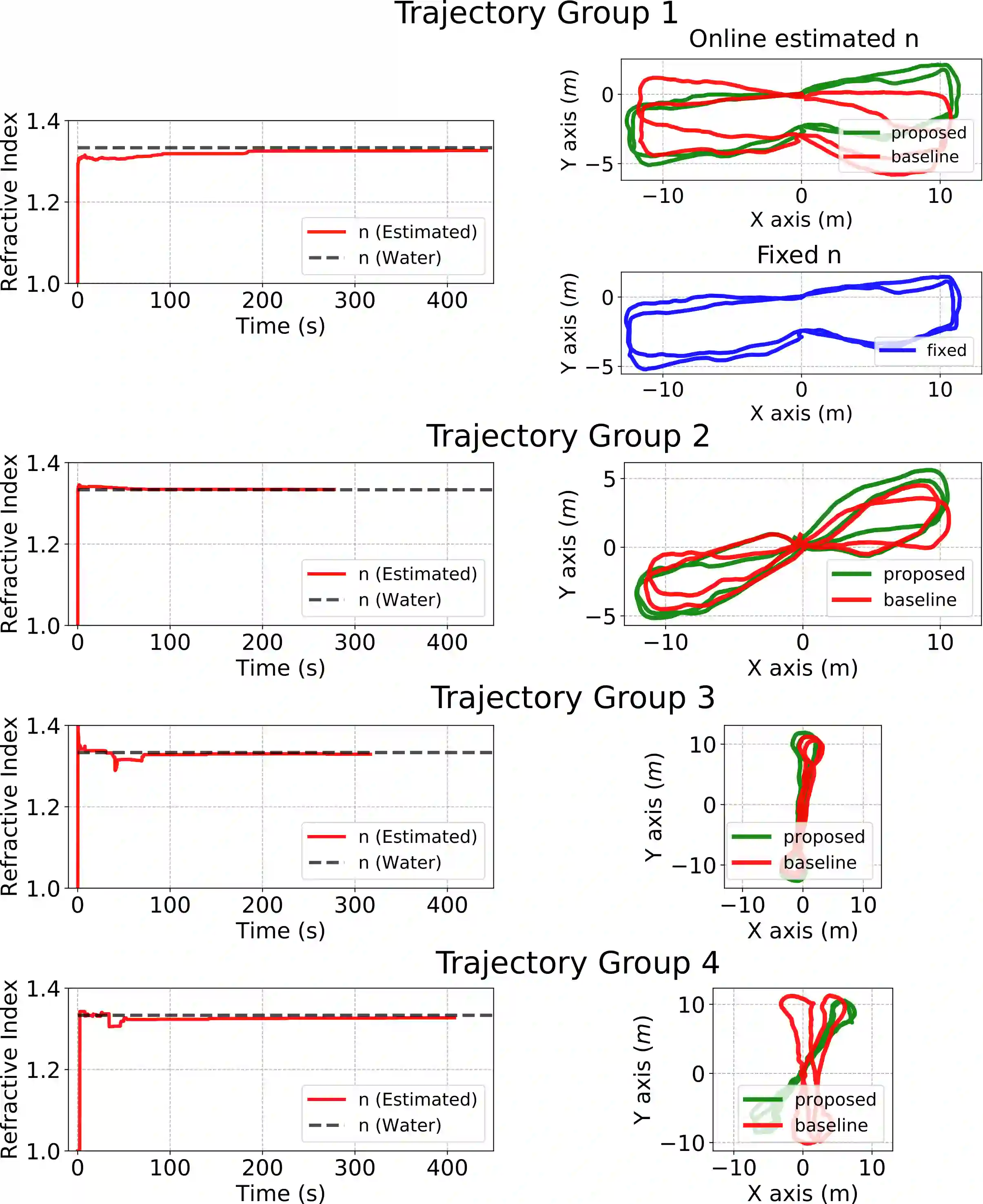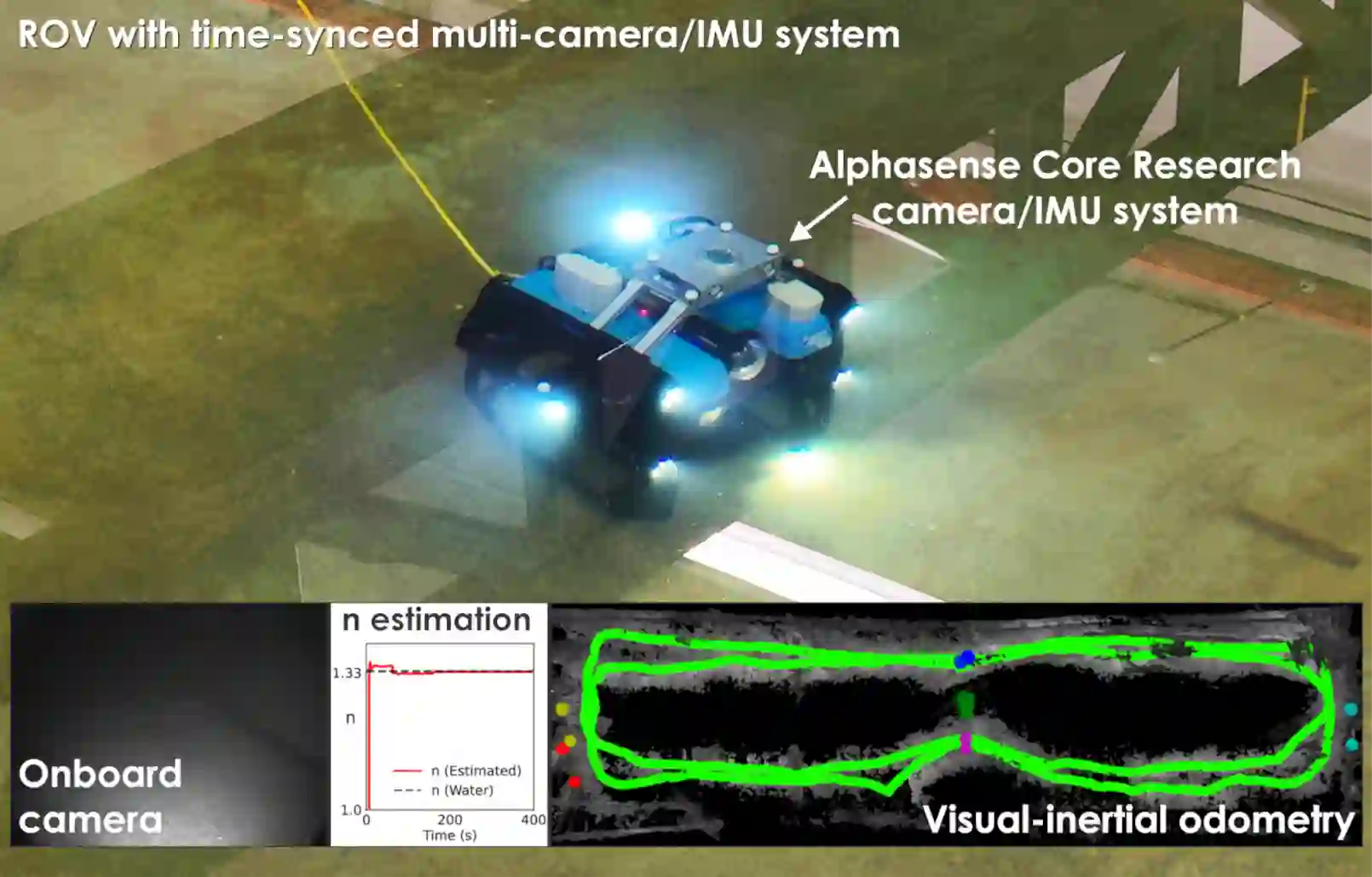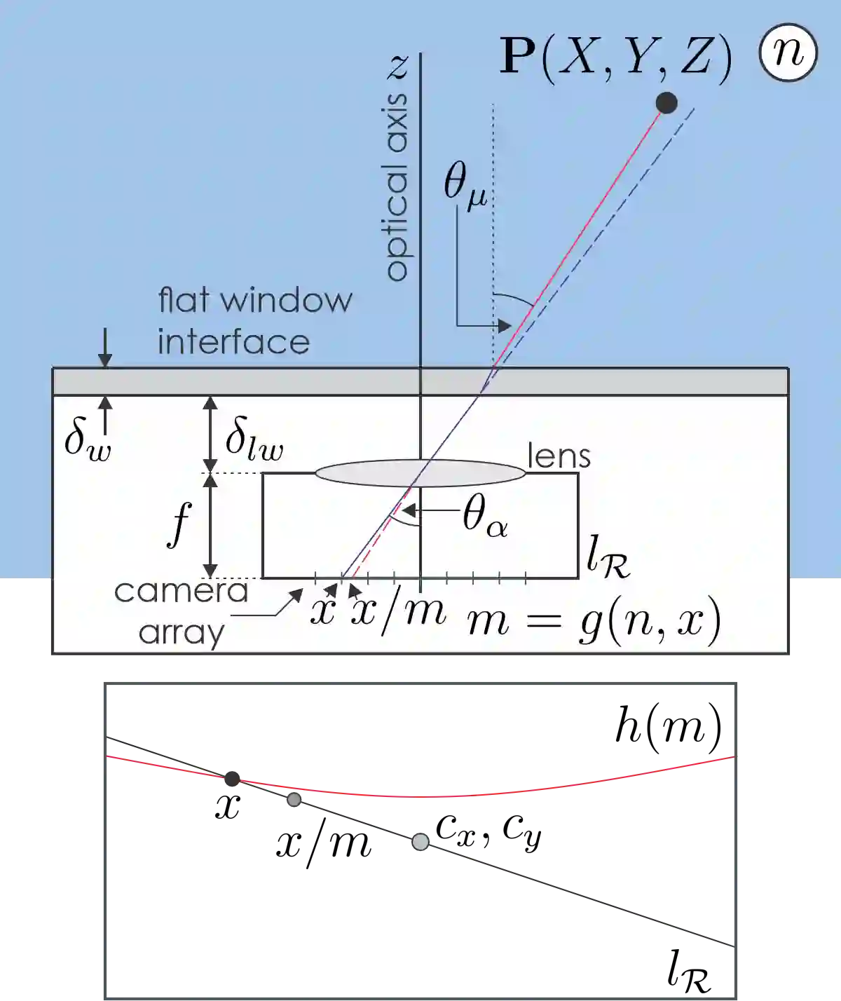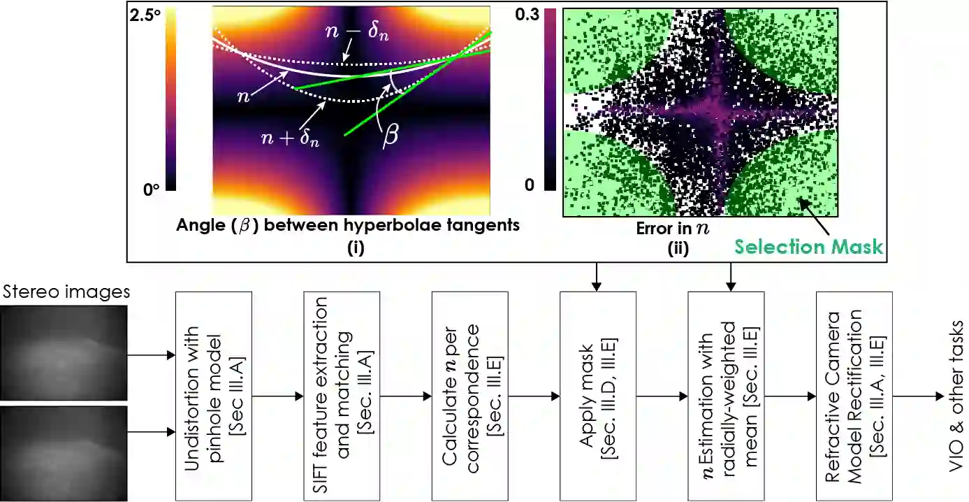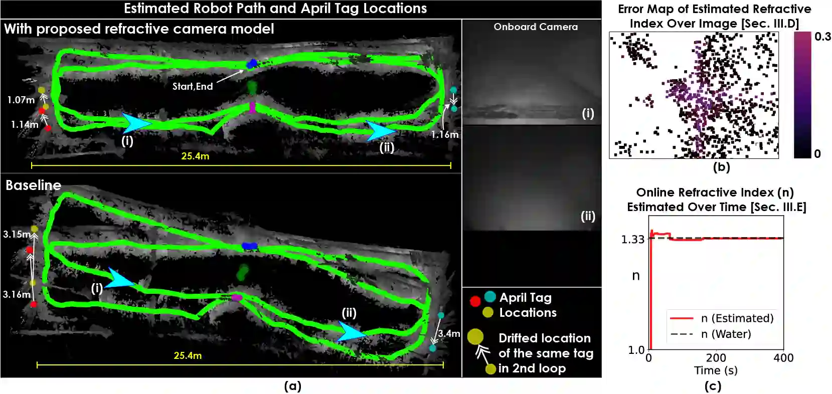 This work presents a camera model for refractive media such as water and its application in underwater visual-inertial odometry. The model is self-calibrating in real-time and is free of known correspondences or calibration targets. It is separable as a distortion model (dependent on refractive index $n$ and radial pixel coordinate) and a virtual pinhole model (as a function of $n$). We derive the self-calibration formulation leveraging epipolar constraints to estimate the refractive index and subsequently correct for distortion. Through experimental studies using an underwater robot integrating cameras and inertial sensing, the model is validated regarding the accurate estimation of the refractive index and its benefits for robust odometry estimation in an extended envelope of conditions. Lastly, we show the transition between media and the estimation of the varying refractive index online, thus allowing computer vision tasks across refractive media.
