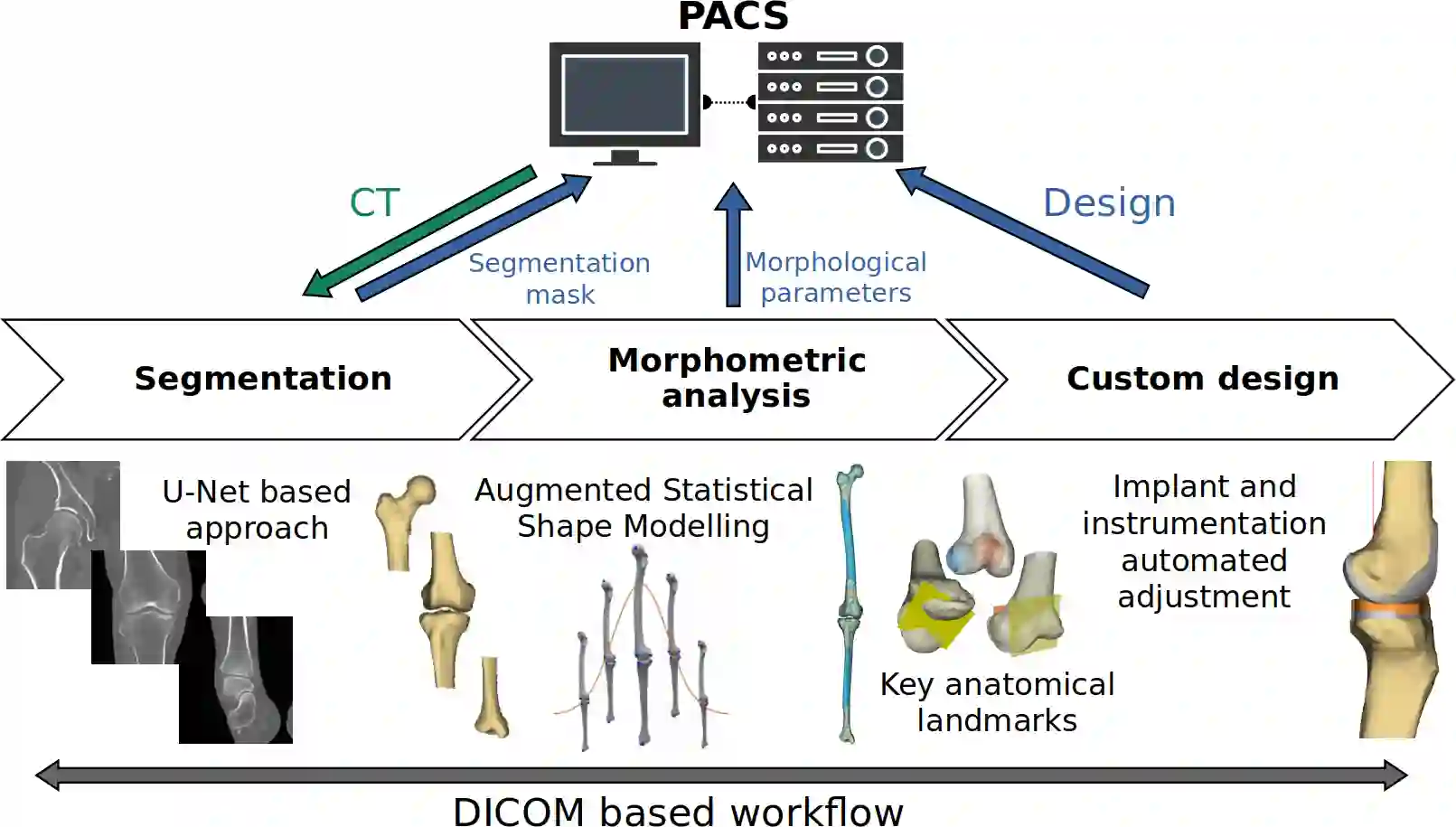 Arthroplasty is commonly performed to treat joint osteoarthritis, reducing pain and improving mobility. While arthroplasty has known several technical improvements, a significant share of patients are still unsatisfied with their surgery. Personalised arthroplasty improves surgical outcomes however current solutions require delays, making it difficult to integrate in clinical routine. We propose a fully automated workflow to design patient-specific implants, presented for total knee arthroplasty, the most widely performed arthroplasty in the world nowadays. The proposed pipeline first uses artificial neural networks to segment the proximal and distal extremities of the femur and tibia. Then the full bones are reconstructed using augmented statistical shape models, combining shape and landmarks information. Finally, 77 morphological parameters are computed to design patient-specific implants. The developed workflow has been trained using 91 CT scans of lower limb and evaluated on 41 CT scans manually segmented, in terms of accuracy and execution time. The workflow accuracy was $0.4\pm0.2mm$ for the segmentation, $1.2\pm0.4mm$ for the full bones reconstruction, and $2.8\pm2.2mm$ for the anatomical landmarks determination. The custom implants fitted the patients' anatomy with $0.6\pm0.2mm$ accuracy. The whole process from segmentation to implants' design lasted about 5 minutes. The proposed workflow allows for a fast and reliable personalisation of knee implants, directly from the patient CT image without requiring any manual intervention. It establishes a patient-specific pre-operative planning for TKA in a very short time making it easily available for all patients. Combined with efficient implant manufacturing techniques, this solution could help answer the growing number of arthroplasties while reducing complications and improving the patients' satisfaction.