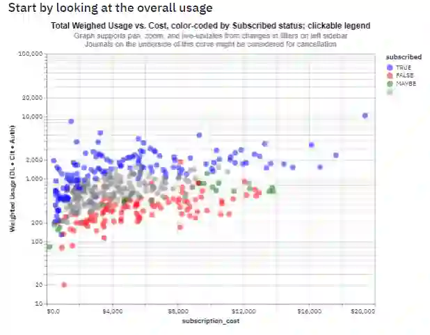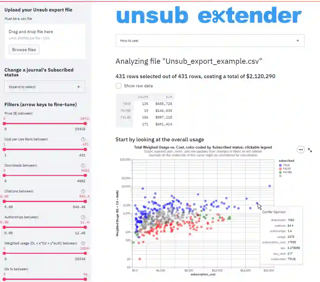 翻译:此篇文章引入了 Unsub 扩展器, 这是一个帮助图书馆分析其 Usub 数据导出文档的免费工具 。 Uunsub 是一个收集开发仪表板, 收集并预报日记级使用量的度量, 以便向学术图书馆提供比传统成本每用更深的测量数据。 Uunsub 提供更丰富、更细化的数据, 分析其订阅量, 但并不包含一个方便地视觉化它所提供的复杂和相互关联的数据点的方法 。 Uunsub 扩展器( https://unsubextender.lib. iastate.edu) 是一个免费 Python 的网络应用程序, 它使用 Unsuble Export 菜单, 并自动将创建互动图和可视化的图解创建。 工具中包含用于探索的示例数据, 用户上传其特定的非子文件文件, 以快速地用实际数据来显示预设的图。 图表是互动的, 启用和支持缩放版图, 能够更精确地将数据复制到 。