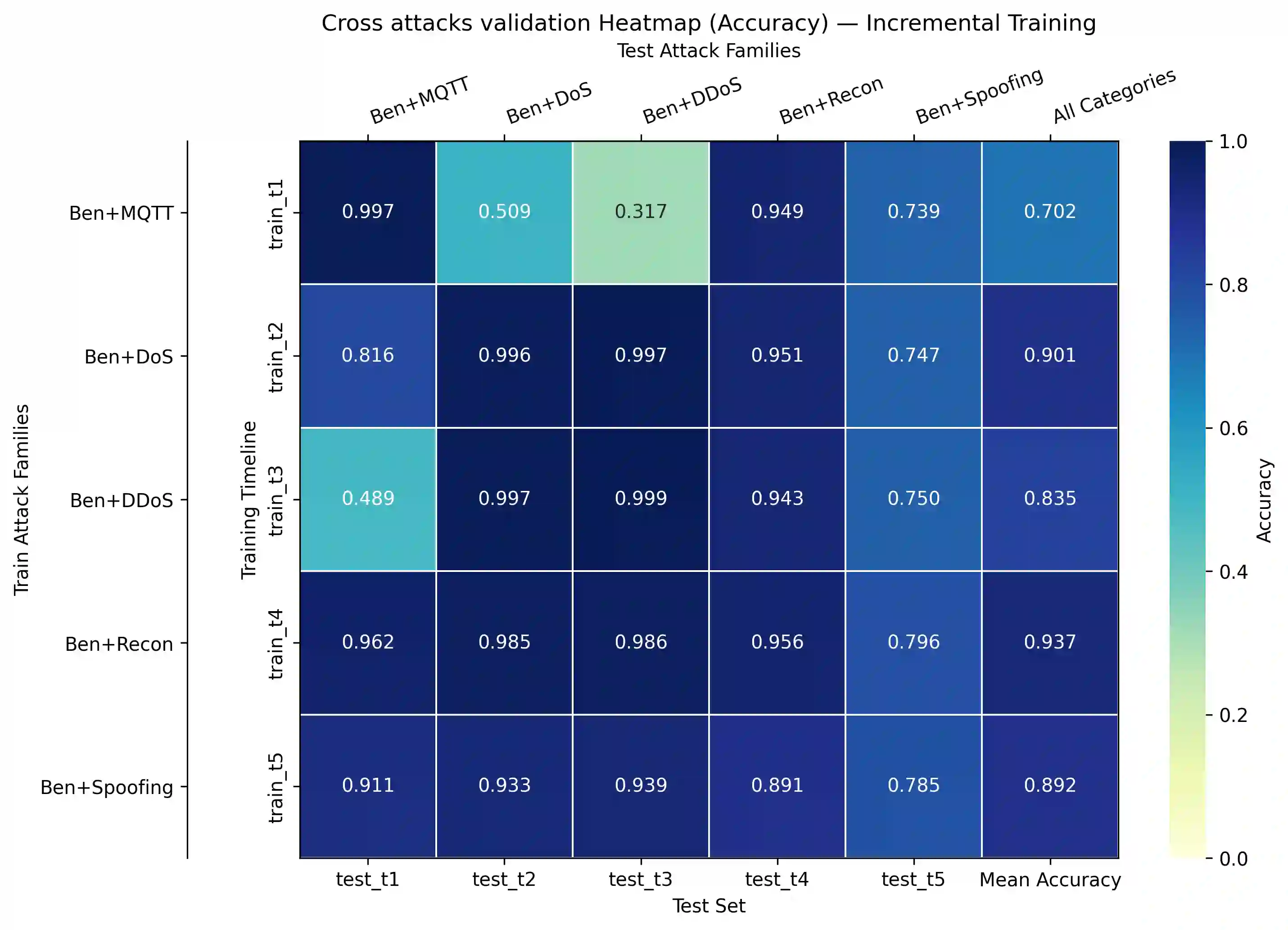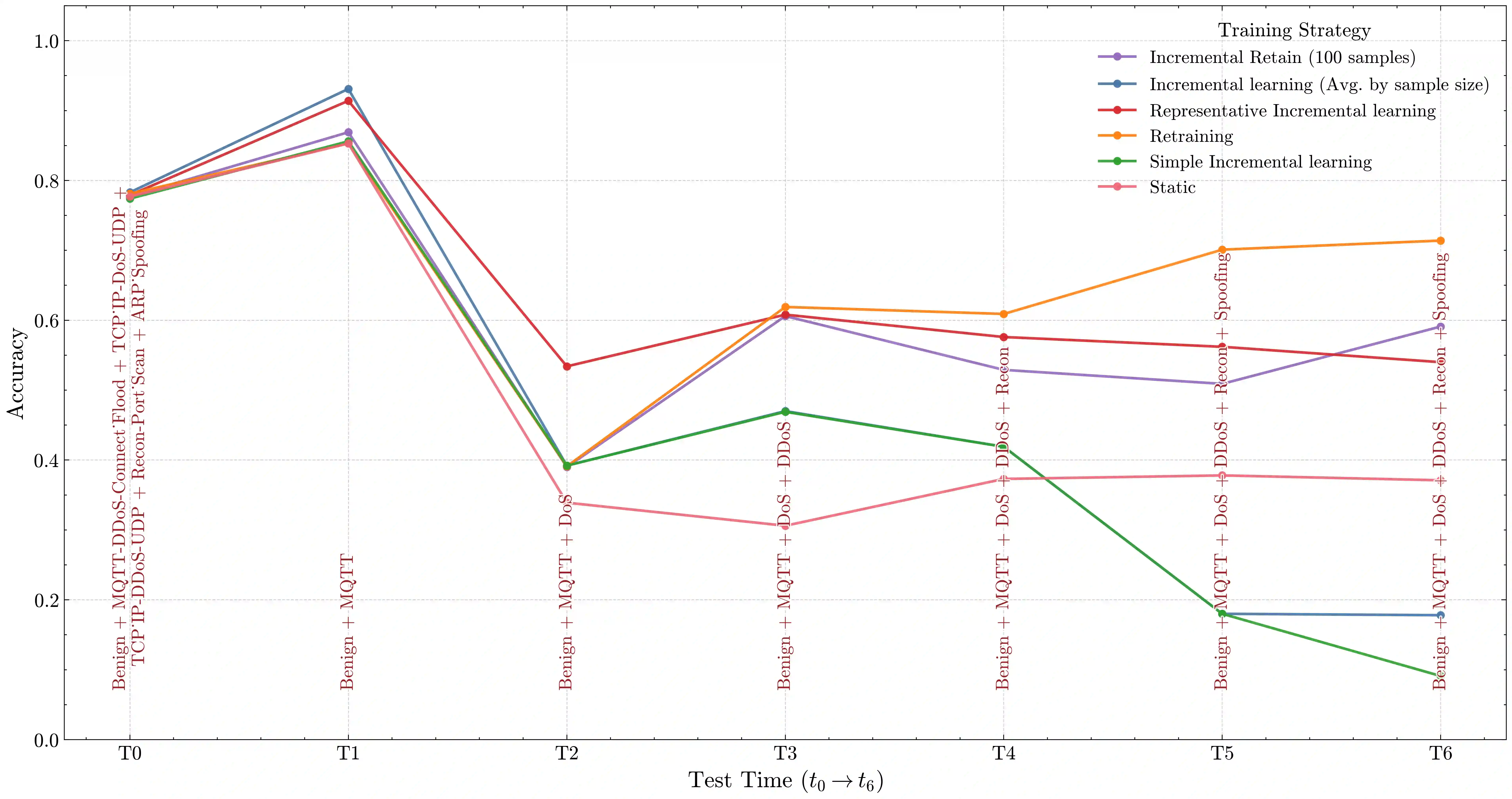 The expansion of Internet of Things (IoT) devices has increased the attack surface of networks, necessitating a robust and adaptive intrusion detection systems. Machine learning based systems have been considered promising in enhancing the detection performance. Federated learning settings enabled us to train models from network intrusion data collected from clients in a privacy preserving manner. However, the effectiveness of these systems can degrade over time due to concept drift, where patterns in data evolve as attackers develop new techniques. Realistic detection models should be non-stationary, so they can be continuously updated with new intrusion data while maintaining their detection capability for older data. As IoT environments are resource constrained, updates should consume minimal computational resources. This study provides a comprehensive performance analysis of incremental federated learning in enhancing the long term performance of non stationary IDS models in IoT networks. Specifically, we propose LSTM models within a federated learning setting to evaluate incremental learning approaches that utilize data and model-based measures against catastrophic learning under drift conditions. Using the CICIoMT2024 dataset, which includes various attack variants across five major categories, we conduct both binary and multiclass classification to provide a granular analysis of the intrusion detection task. Our results show that cumulative incremental learning and representative learning provide the most stable performance under drift, while retention-based methods offer a strong accuracy and latency trade off. The study offers new insights into the interplay between training strategy performance and latency in dynamic IoT environments, aiming to inform the development of more resilient IDS solutions considering the resource constraints in IoT devices.