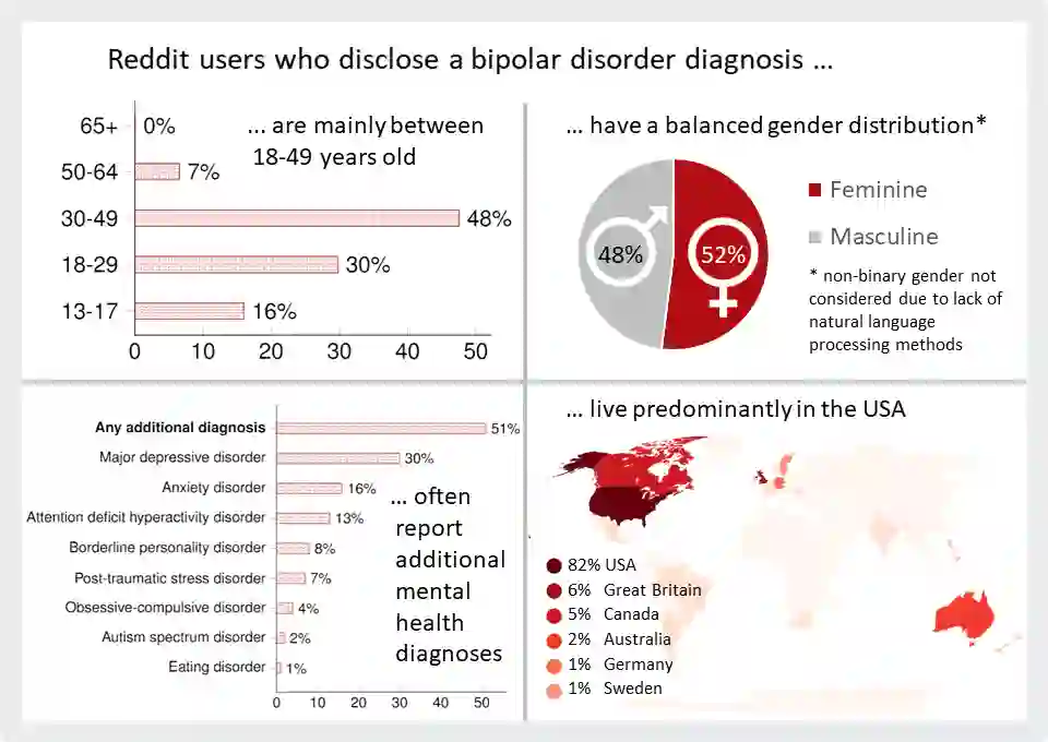 Recently, research on mental health conditions using public online data, including Reddit, has surged in NLP and health research but has not reported user characteristics, which are important to judge generalisability of findings. This paper shows how existing NLP methods can yield information on clinical, demographic, and identity characteristics of almost 20K Reddit users who self-report a bipolar disorder diagnosis. This population consists of slightly more feminine- than masculine-gendered mainly young or middle-aged US-based adults who often report additional mental health diagnoses, which is compared with general Reddit statistics and epidemiological studies. Additionally, this paper carefully evaluates all methods and discusses ethical issues.